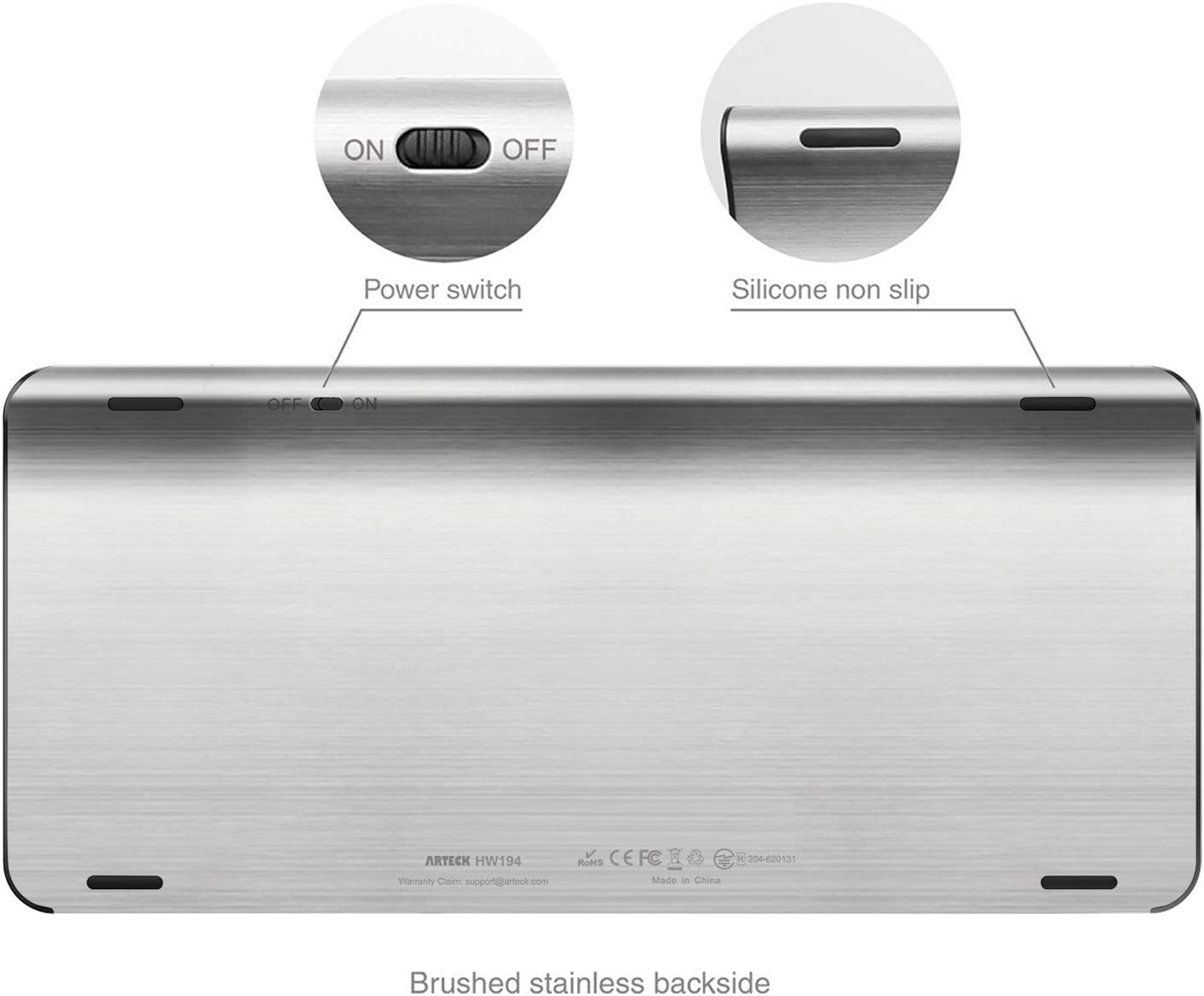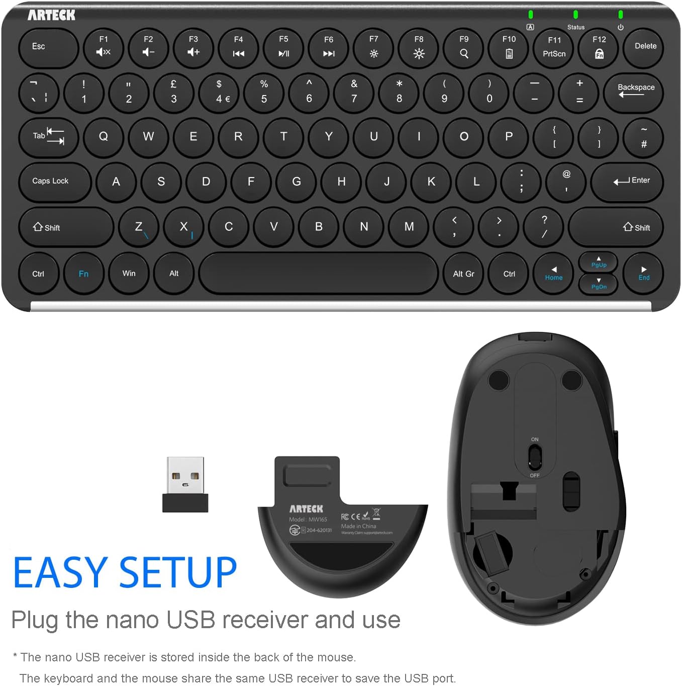 What You Get: Arteck HW194 Wireless Keyboard, MW165 Wireless Mouse, one nano USB receiver for both keyboard and mouse (stored in the back of the mouse), USB charging cable, welcome guide, our 24-months warranty and friendly customer service.