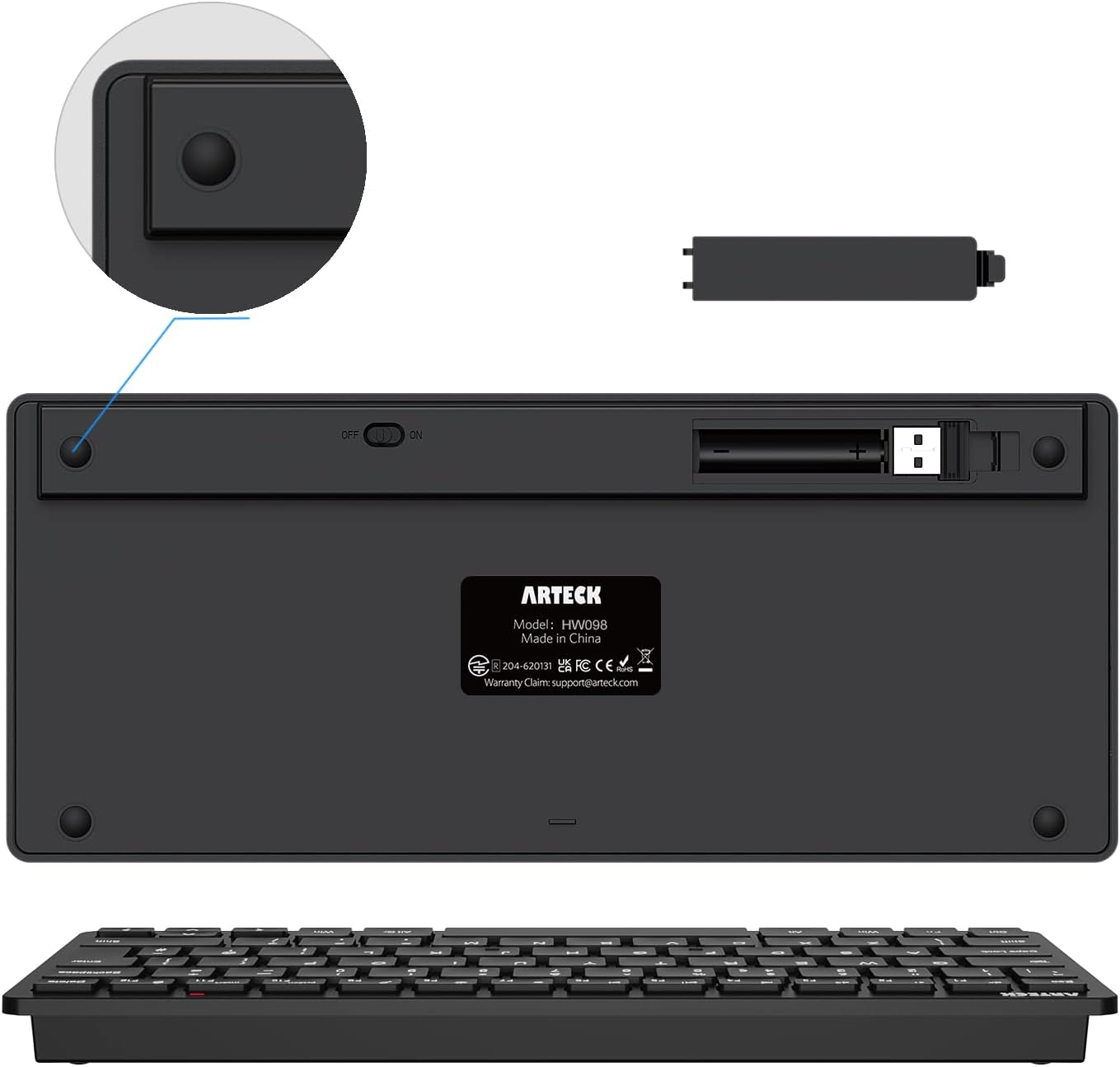 Package contents: Arteck HW098 Bluetooth Keyboard, nano USB receiver, 2 X AAA batteries, welcome guide, our 24-month warranty and friendly customer service.