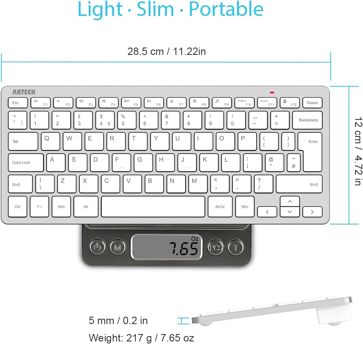 Ultra Thin and Light: Compact size (11.12 X 4.7 X 0.2in) and light weight (7.65oz) but provides full size keys, shortcuts for comfortable typing.