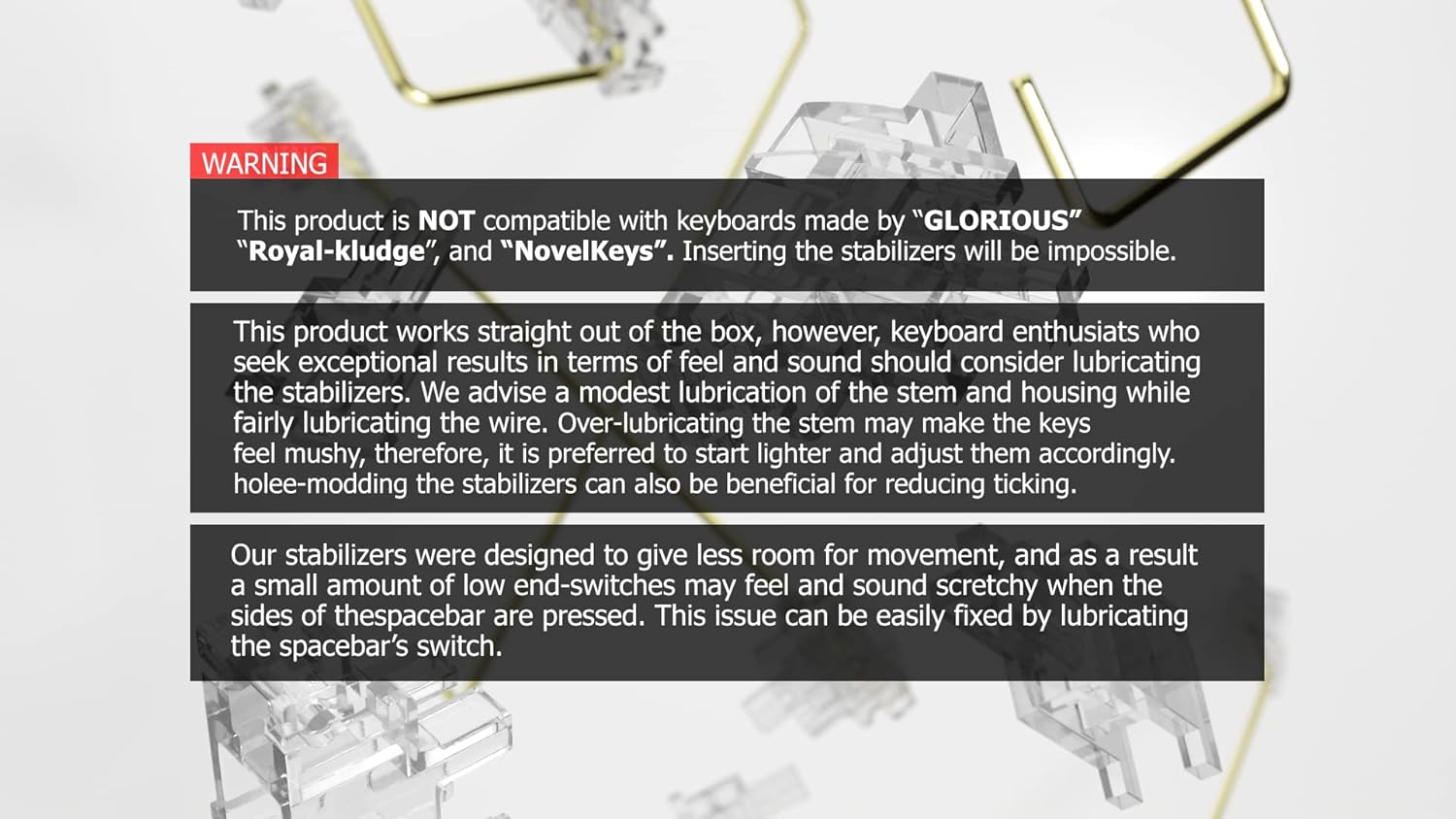 I am somewhat new to the mechanical keyboard modding scene and recently purchased a new keyboard. In my quest to improve the acoustics and feel of the keyboard, I decided to purchase these stabilizers. While I had used stabilizers from other companies, such as Durock, in the past on other keyboards, I was working on a more high-end build and so I was enthralled by the supposed higher quality of these stabilizers, especially since options are more limited on the plate-mounted side of things.These stabilizers definitely look and feel high quality, especially compared to the stock stabilizers that came on my board. While they aren’t magical in any way, as I still needed to mod them to reduce rattling and ticking noises, they feel extremely good and I have been enjoying these stabilizers very much. I will say though that these stabilizers are slightly bigger than normal and they were an extremely tight fit on my keyboard. They went in fairly easily, had to use a bit of light force but nothing too crazy, like the same amount of force needed to install a switch. The problem for me though was taking them out. Most of them came out fine but two of the “housings” for lack of a better term did not want to come back out, and in the end, I ended up breaking one of the stabilizers which was upsetting. Thank goodness my set came with an extra stabilizer housing which came in clutch, but if it wasn’t for that I would’ve been left hanging. The new housing did not have the same issue when used in the same spot as the housing that broke, so either the old stabilizer warped the hole enough to make the new one fit better, which I doubt considering my keyboard uses a steel plate, orrr each stabilizer housing has varying QC, which can be dangerous. Either way, I am still mostly happy with the purchase regardless of this size issue as I got everything to work nicely in the end, even if it was a bit painful.Now, here’s the thing. If you’re just planning to use these stabilizers stock as an upgrade from the ones included in your keyboard, then these are fine for the price. I do think these stabilizers are better than the Durock ones when both are compared out-of-the-box, but that’s as far as it goes. When modded with lube and the holee mod, both these and the Durock stabs are basically the exact same. The problem here is, I reckon most people who are even considering buying new stabilizers at all are doing so with the intention of modding them, since buying stabilizers in the first place is such an enthusiast thing to do, which makes these a hard sell at the $20 price tag in my honest opinion. And even then, as mentioned before, they still had ticking issues out of the box anyway, so the recommendation is to mod them anyway. Ultimately though I do think these are at least worth trying out if you really want the best of the best when it comes to plate mounted stabilizers.