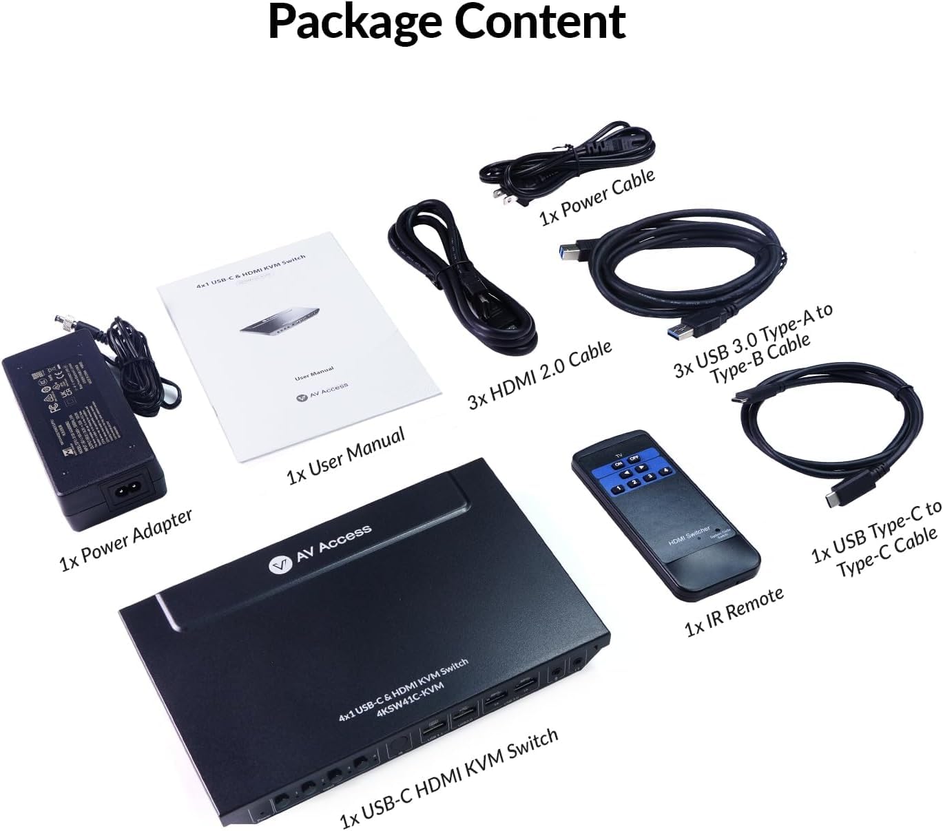 【Package List】1* 4K USB-C HDMI KVM Switch, 3* HDMI 2.0 Cable, 1* USB Type-C to Type-C Cable, 3* USB 3.0 Type-A to Type-B Cable, 1* Power Adapter (DC 24V, 5A), 1* IR Remote, 1* User Manual