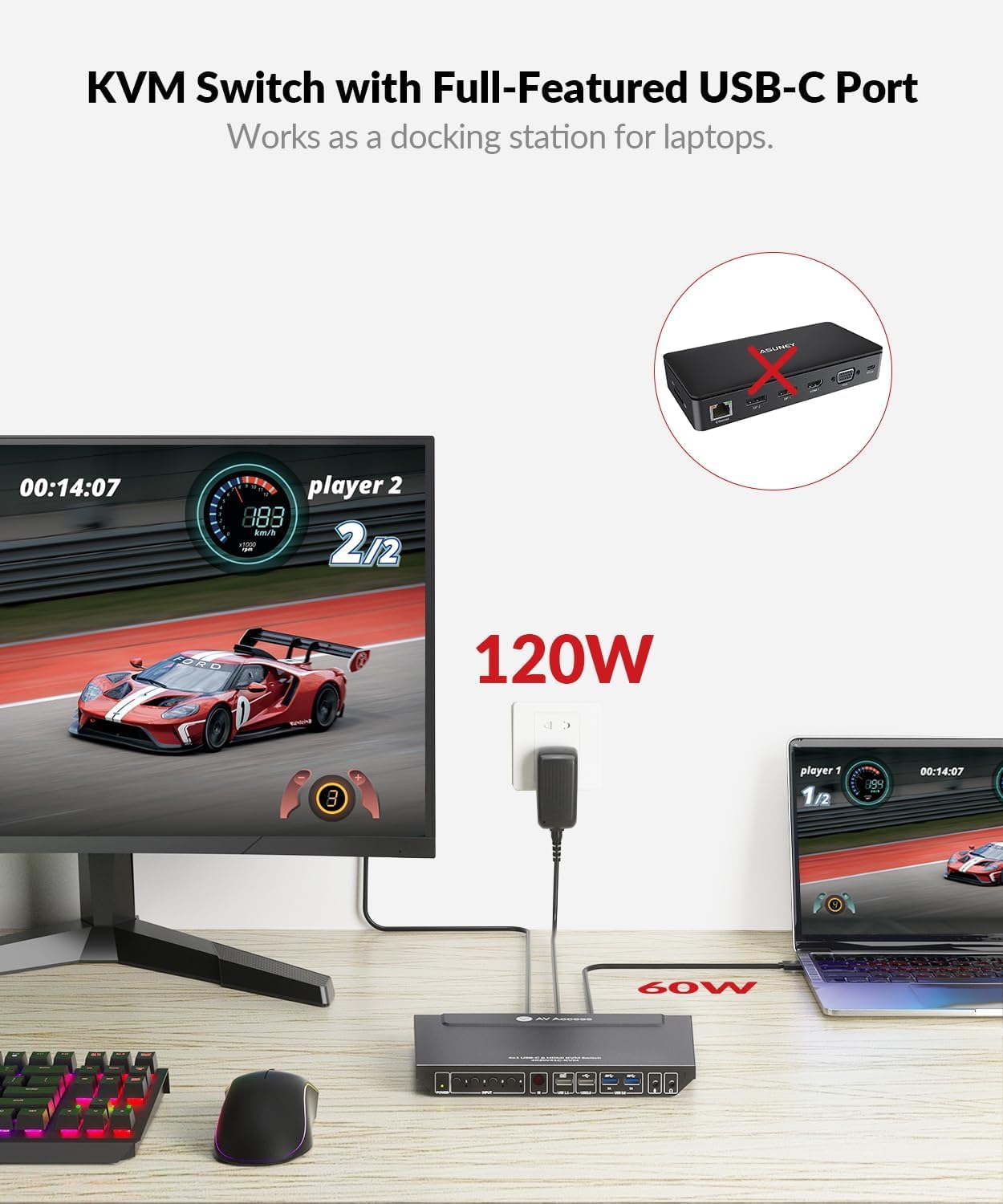 AV Access 4K KVM Switch 4 Computers 1 Monitor 4×1 USB-C & HDMI USB 3.0, Supports 60W Charging for Laptop, 2560×1440@144/120hz & 1080P@240/165hz, Ideal for Home Office & Gaming