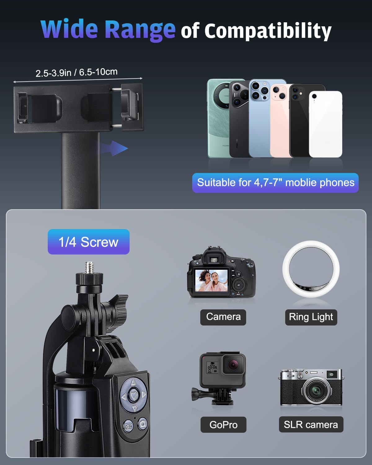 【𝗔𝗹𝗹-𝗶𝗻-𝗢𝗻𝗲 𝗦𝗲𝗹𝗳𝗶𝗲 𝗦𝘁𝗶𝗰𝗸 𝗧𝗿𝗶𝗽𝗼𝗱】This 3-in-1 design works as a selfie stick, desktop stand, or full tripod — perfect for vloggers, content creators and everyday users alike. Switch to tripod mode with a single press. The universal phone holder fits devices from 6.5cm to 10cm wide, while the standard 1/4″ screw mount supports smartphones, GoPros, cameras, and ring lights with ease.