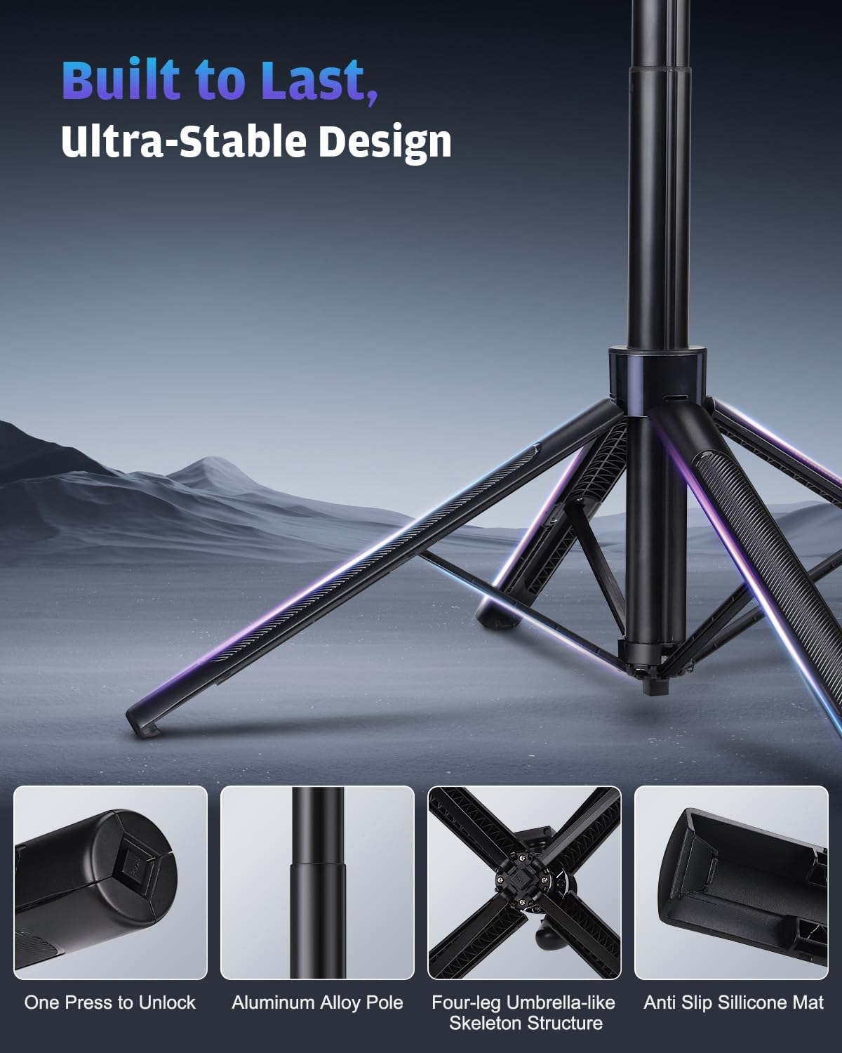 【𝗧𝗮𝗹𝗹, 𝗦𝘁𝗮𝗯𝗹𝗲, 𝗮𝗻𝗱 𝗧𝗿𝗮𝘃𝗲𝗹-𝗙𝗿𝗶𝗲𝗻𝗱𝗹𝘆 𝗧𝗿𝗶𝗽𝗼𝗱】Get the perfect wide-angle or full-body shot with the 180cm extendable aluminium pole. Folds down to just 30cm — compact enough to pop in your rucksack or carry-on. Great for holidays, events or daily use. The reinforced umbrella-frame base and four extended legs keep things rock solid, wherever you shoot.