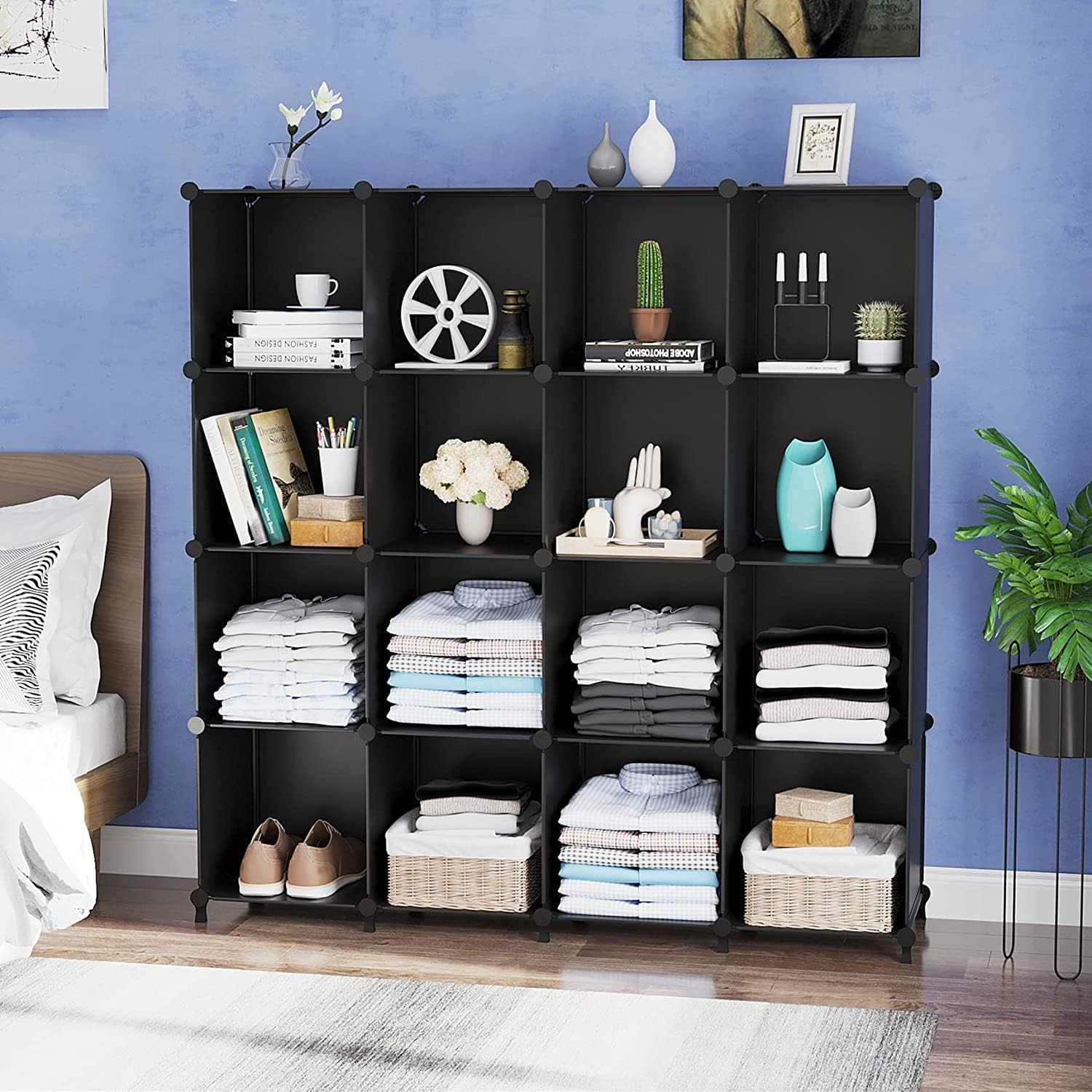It can be used as closet, bookshelf, multipurpose storage shelf to store clothes, shoes, books, crafts, toys, yarn, bags.This modular storage cube organization includes 16 cubes, which is easy to assemble and disassemble.You can diy it into different combinations and shapes to suit your needs.