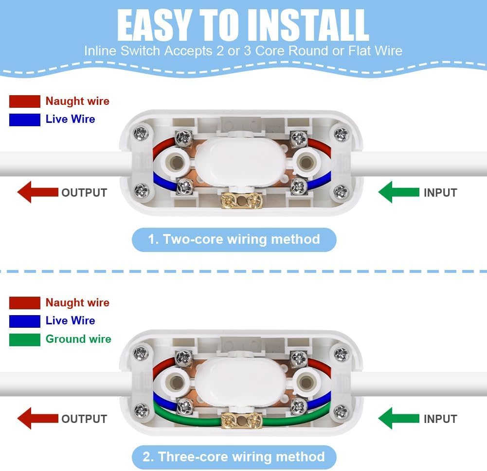 【EASY TO INSTALL】It use screw terminals to fix, no need for welding, easy to install. You can use a two-wire connection or a three-wire connection. It just press the corresponding wire into the wiring hole of the switch, close the shell and tighten it to complete the installation. (Supports light cord up to 6.5mm diameter)