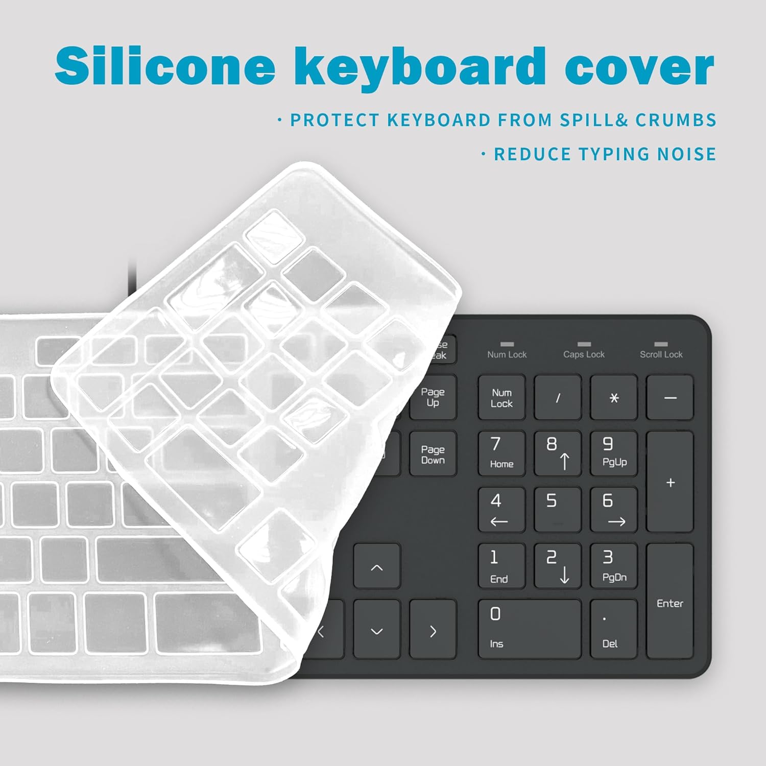 【 EXCELLENT TYPING EXPERIENCE 】 With comfortable low-profile keys and standard PC keyboard layout with full-size design allow for quiet and efficient typing – excellent for your daily use. Especially compared to a noisy mechanical keyboard. Each keystroke produces a soft sound, providing a very pleasant typing experience. (Big key may be a little louder than normal key but the silicone cover attached with keyboard can reduce the noise)