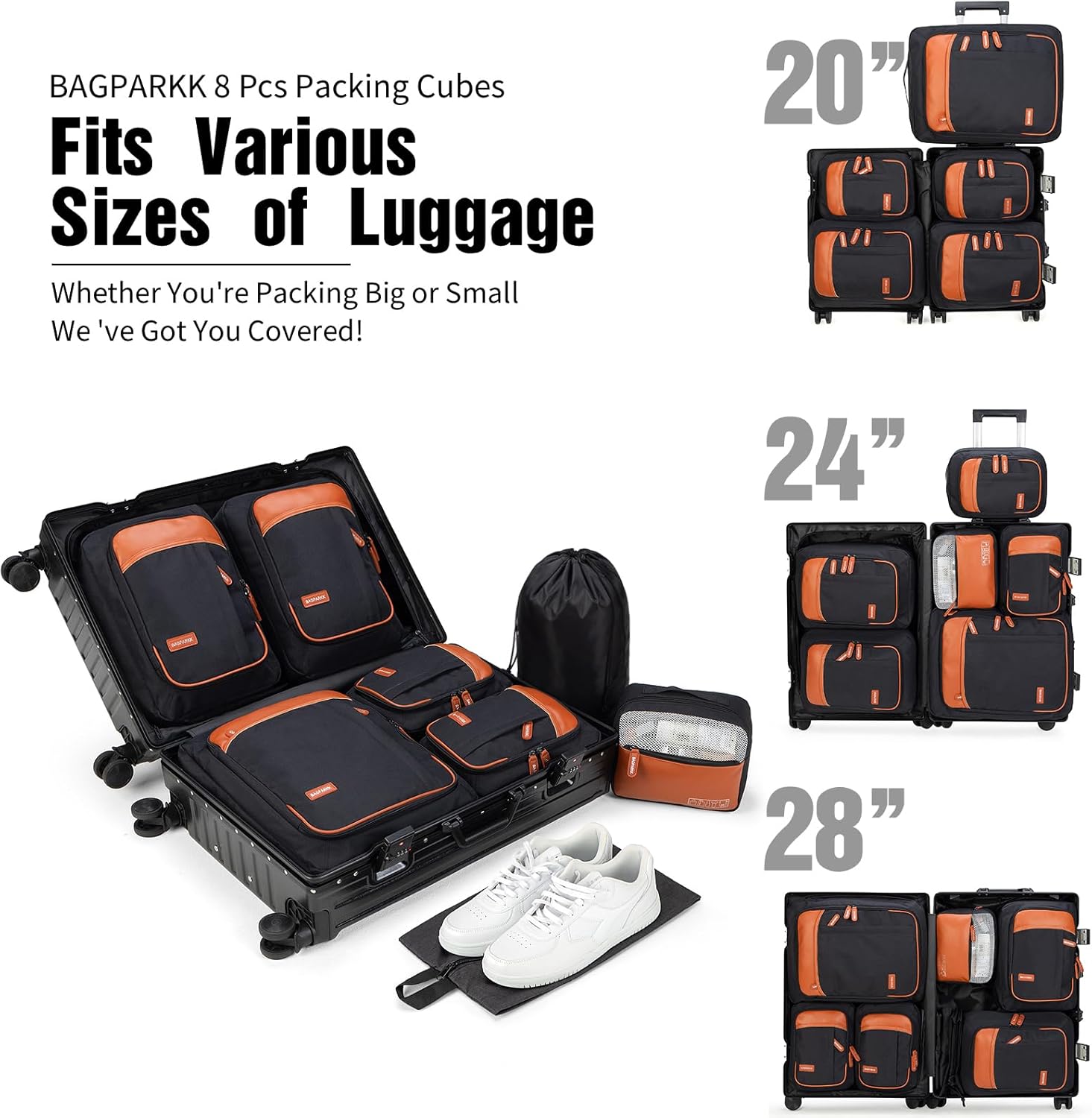 ORGANIZED PACKING & SPACE SAVING:BAGPARKK Luggage Organizers Come with 8 travel packing cubes for different kinds of luggage.They let you easily and effectively organize and separate each type of clothing together;make full use of your suitcase space; plus, the flexible material lets you fit them into any suitcase without taking up too much space, even in carry-ons.