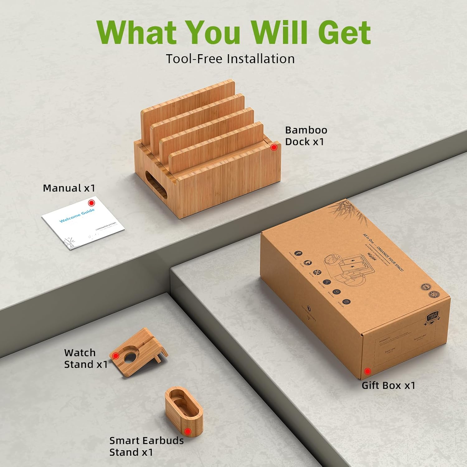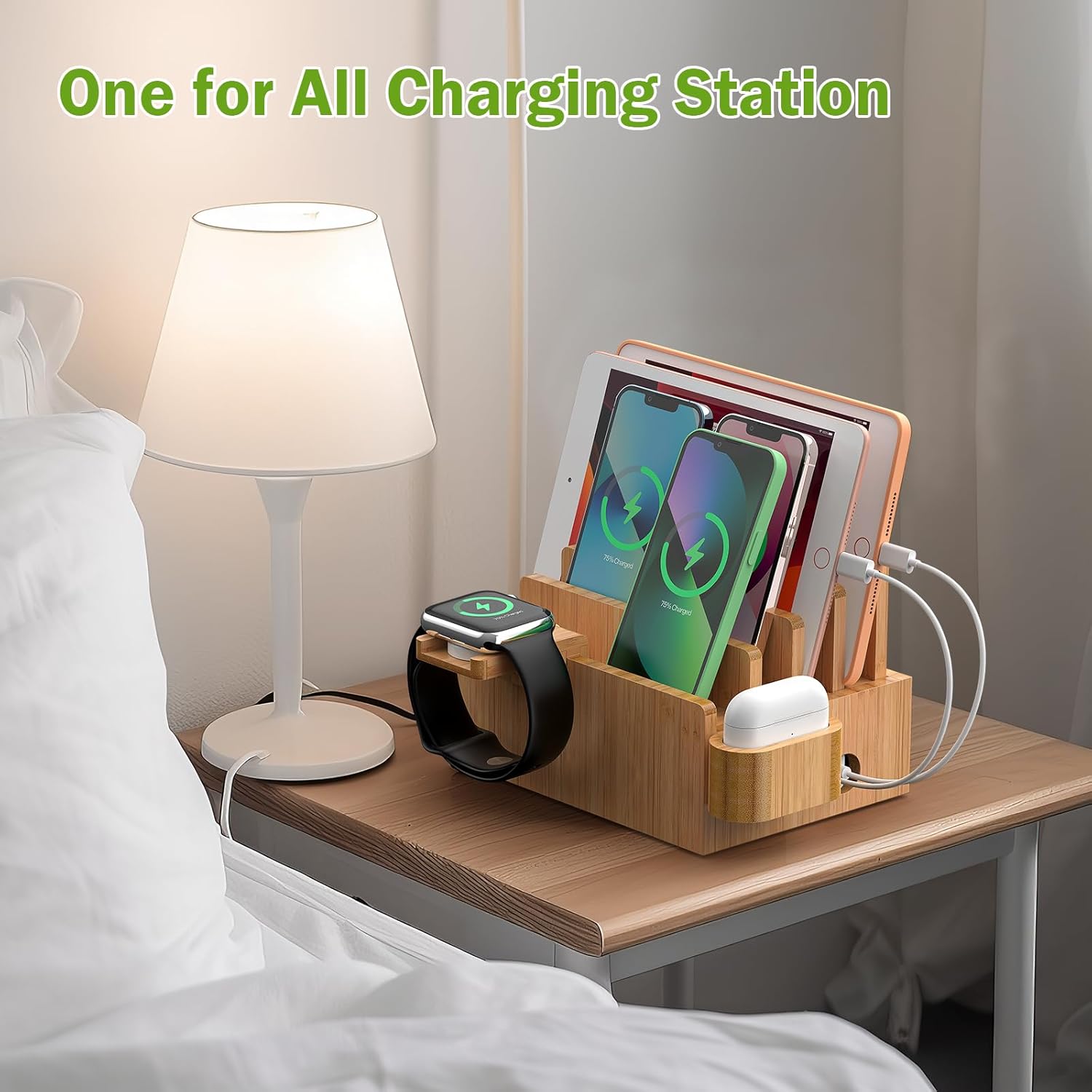 What You Get – 1 X Bamboo Charging Station, 1 X Watch Stand,1 X Earbuds Stand. (➤No USB Charger)You won’t worry about different charging requirement for different devices and will have a happy and convenient life with this Charging Docking Station & Organizer
