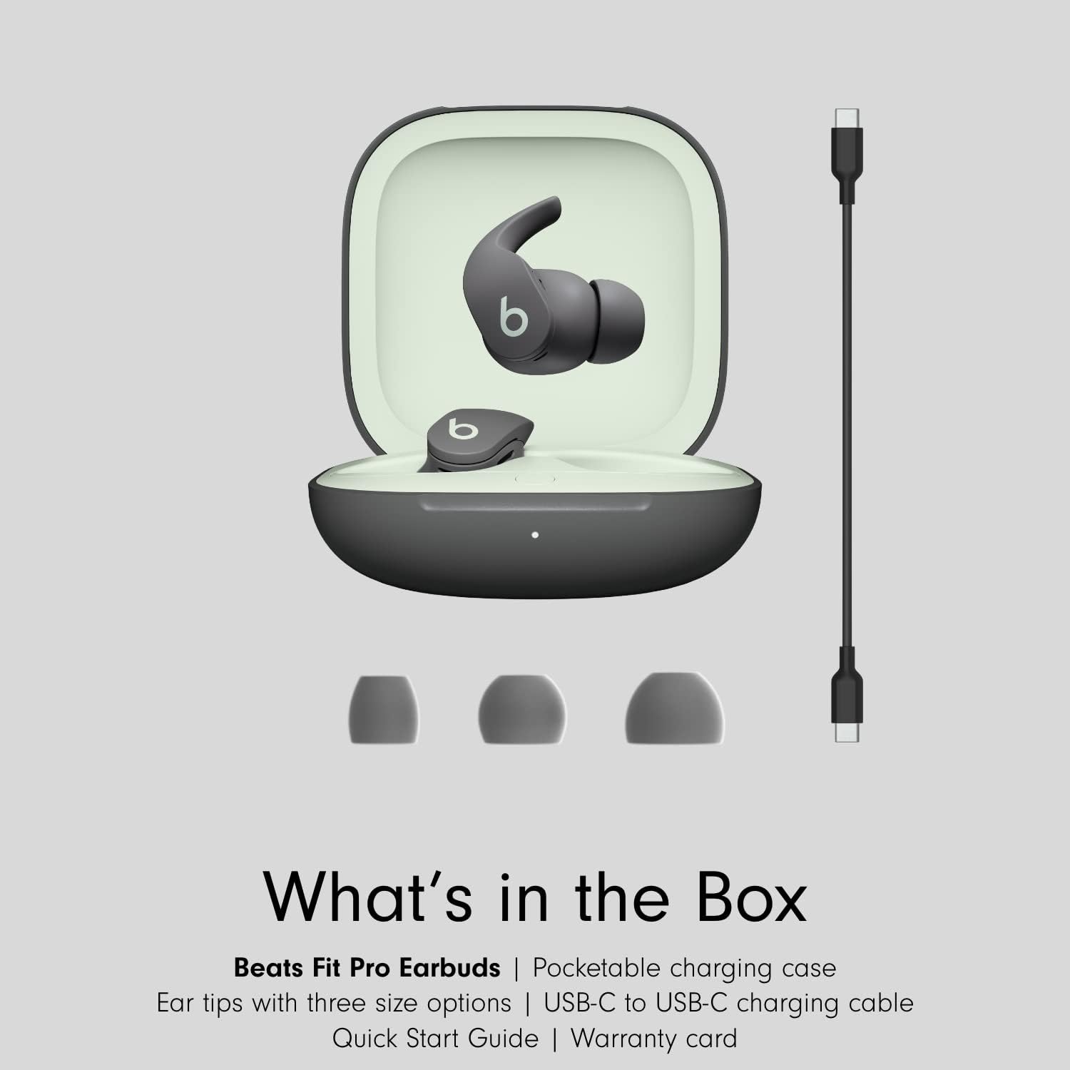 What’s in the Box – Beats Fit Pro True Wireless Noise Cancelling Earbuds; Matching charging case; Eartips with three size options; USB-C to USB-C charging cable; Quick Start Guide; Warranty card. (USB-C power adapter sold separately)