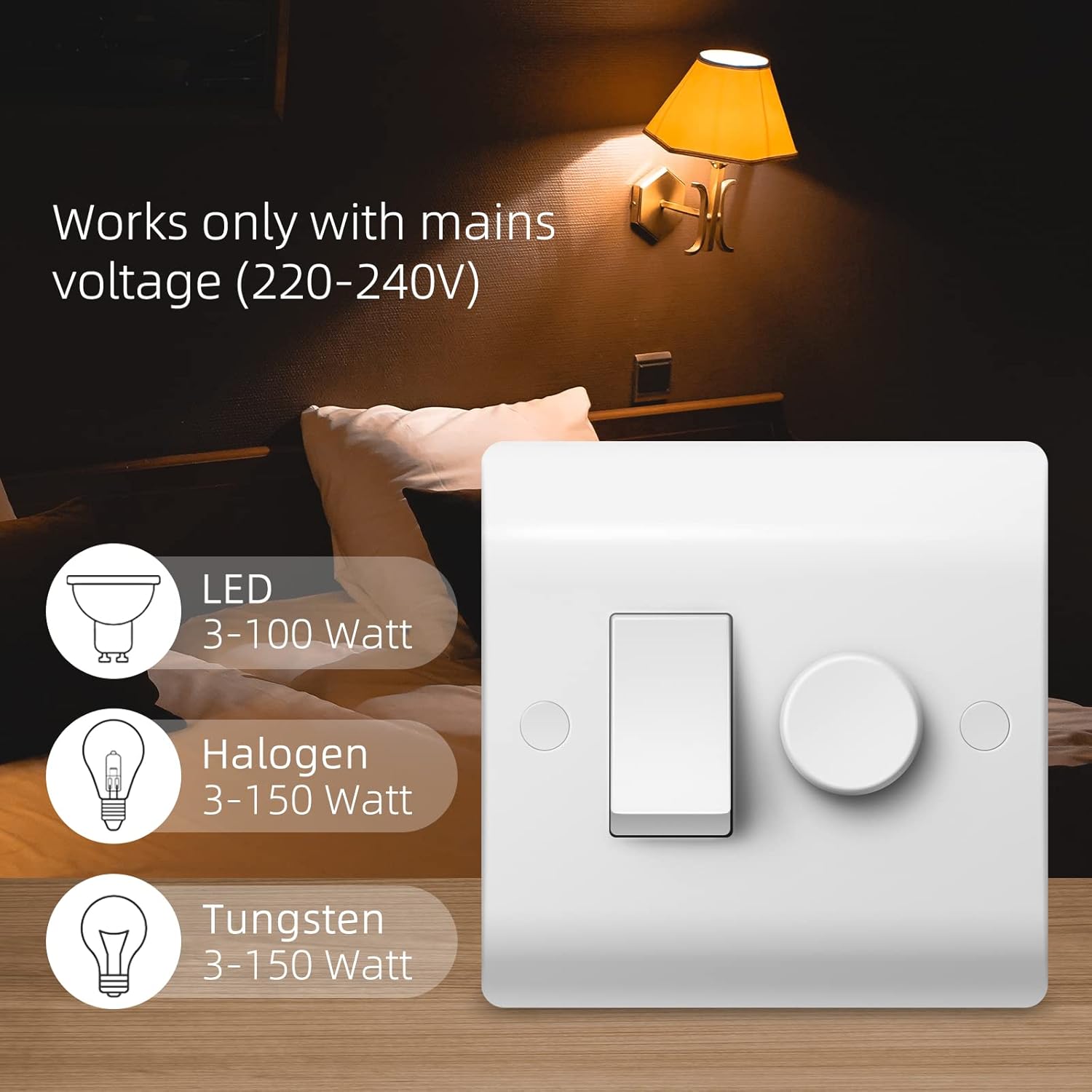 Dimmer switch load: For dimmable LEDs (3-100 watts) | For Halogen & Tungsten (3-150 watts).
