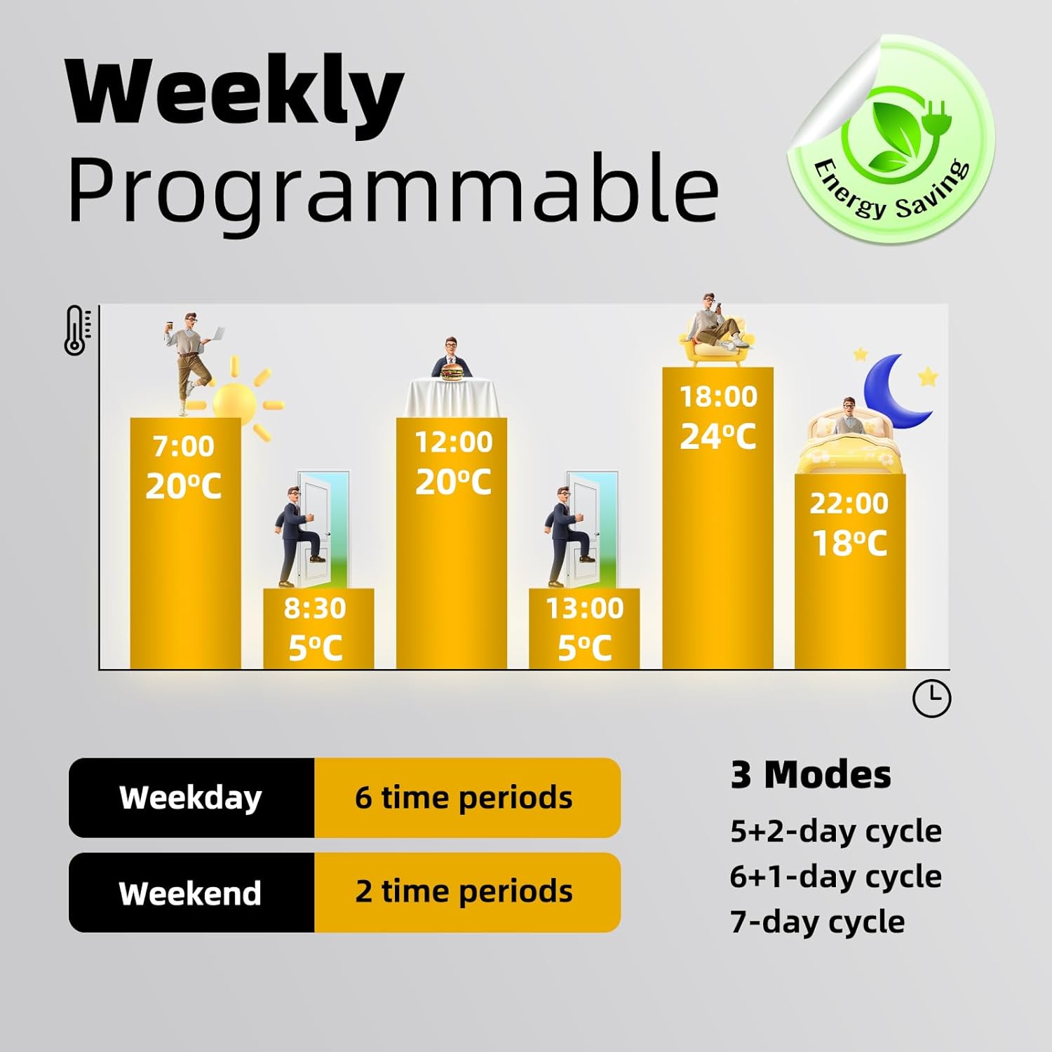 【Programming Thermostat】 The device has 3 programmable method of 5+2/6+1/7(6 periods for weekday and 2 periods for weekend), with which you can adapt the heating of your house to your lifestyle, so that make you feel warm at home and save energy when you are out.