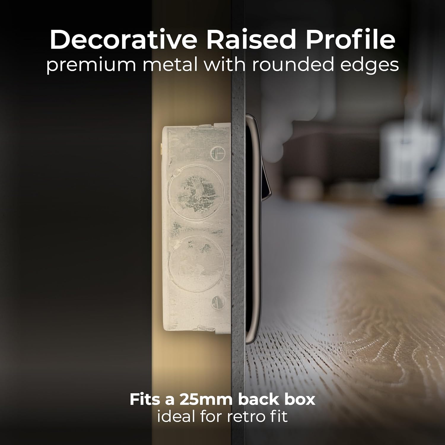 This 13A double socket from BG in black nickel finish with black inserts has a slim profile with rounded corners. With integrated moisture control gasket and fits 25mm back box – ideal for retro fit.