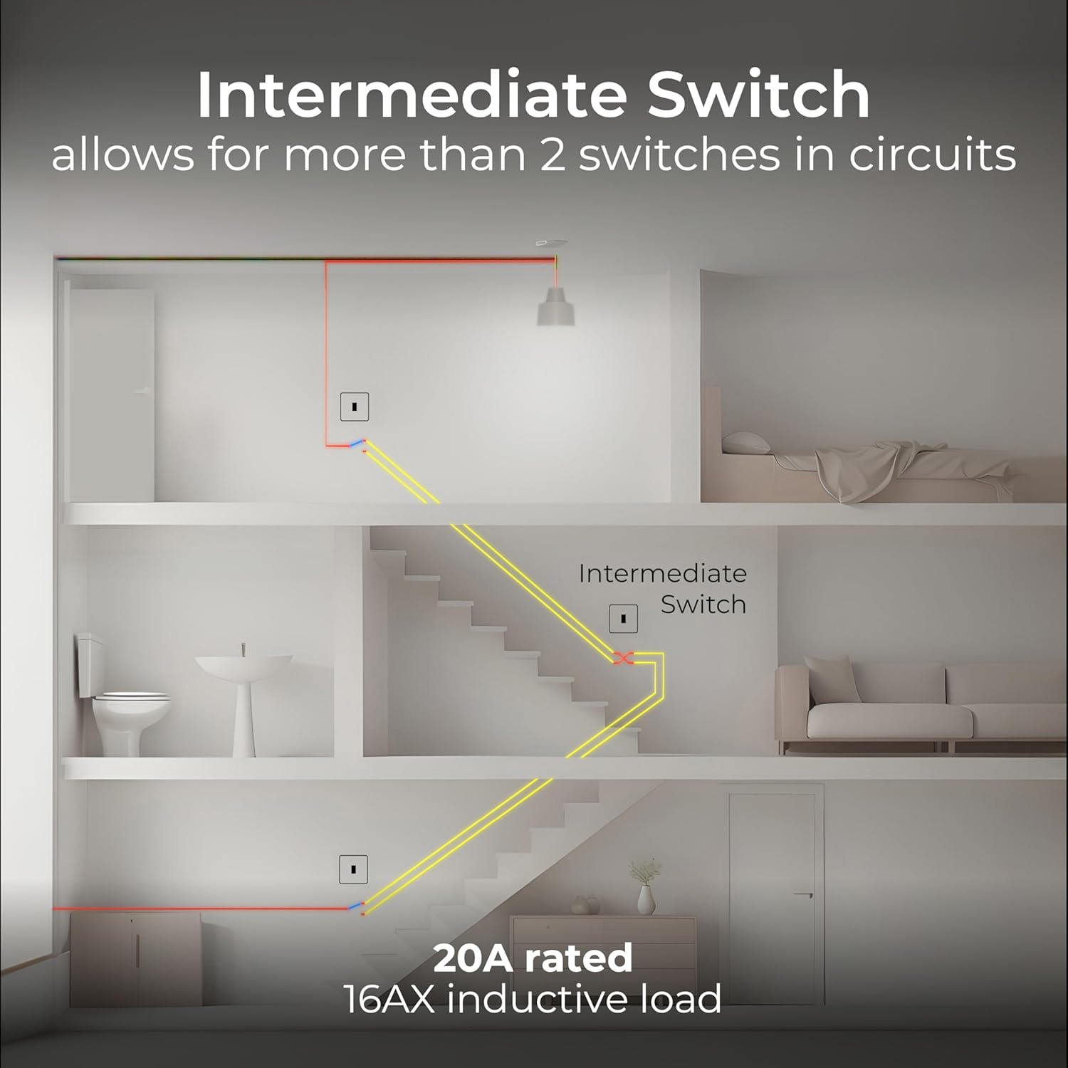 USE AS THE MIDDLE SWITCH WHEN MORE THAN TWO LIGHT SWITCHES ARE NEEDED FOR ONE LIGHT: Operate a light in a space when placed between two other light switches, such as at the top of the stairs in addition to either end of a hallway