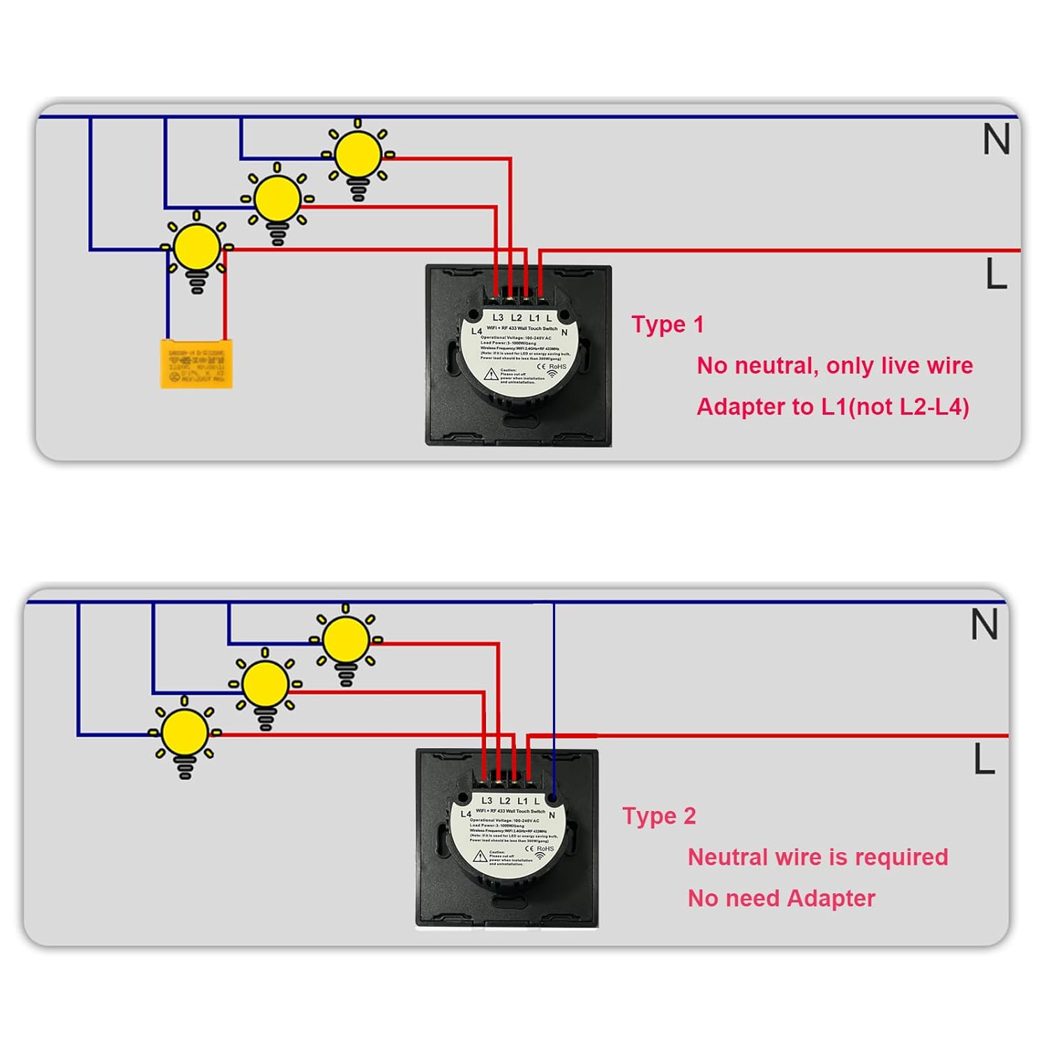 Easily Install: Bkiyougo Light Switch Use Standard size, screwless snap-on wall plate. Manual will guide you through the wiring process and set the App. No hub required, for 2.4G Wi-Fi only (NOT 5G). 1-Way wiring, Neutral wire is required. Power supply: 600W/gang, AC 90-250V.