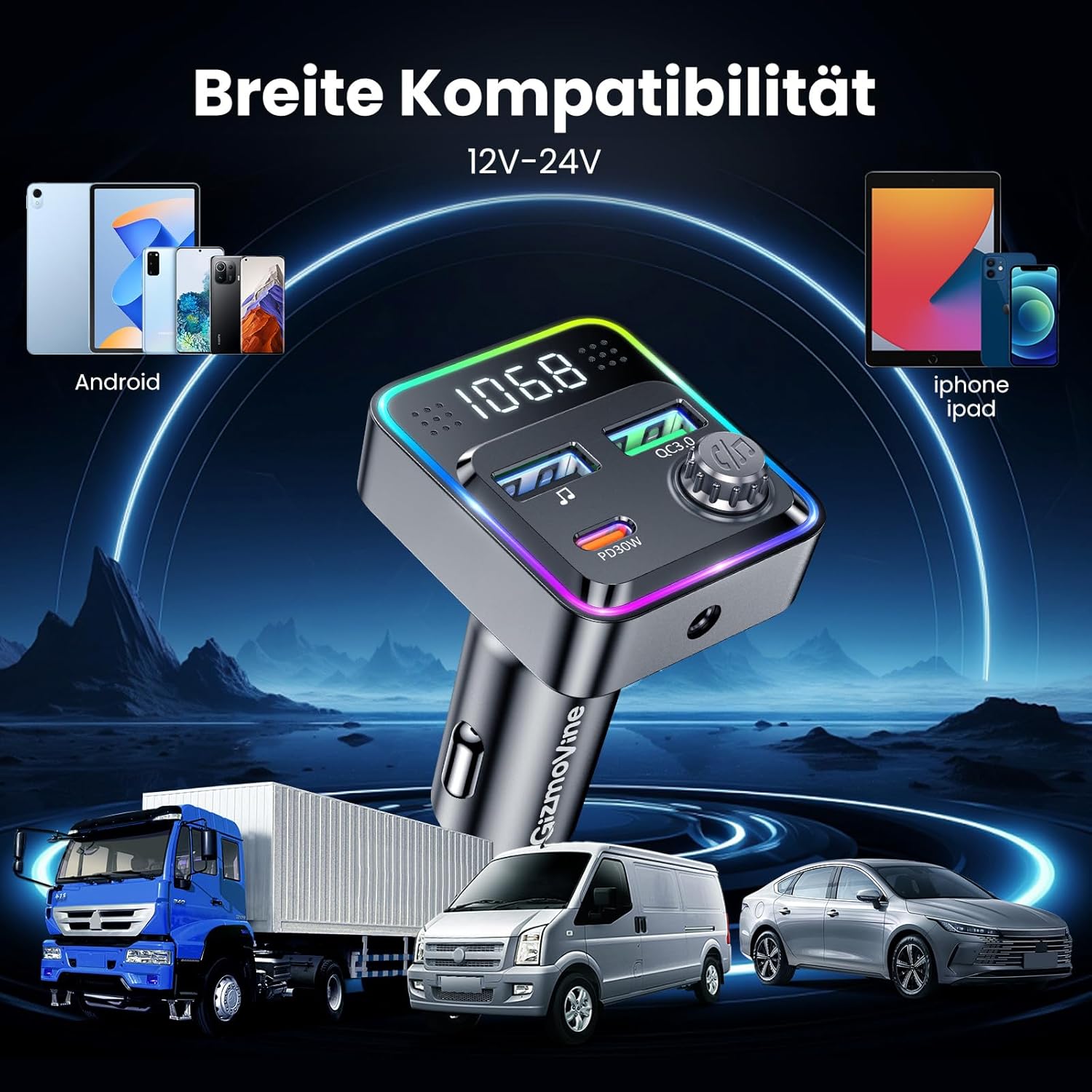 【Fast Charging for Bluetooth Car Adapter】Our car radio bluetooth transmitter,Comes with 3 USB ports(PD30W, QC3.0, 12W/25W) included, you can charge multiple devices while you’re listening to music or podcasts. The USB C PD 30W and USB-A QC3.0 quick-charge options top up your phone battery quickly, which is four times faster than usual.