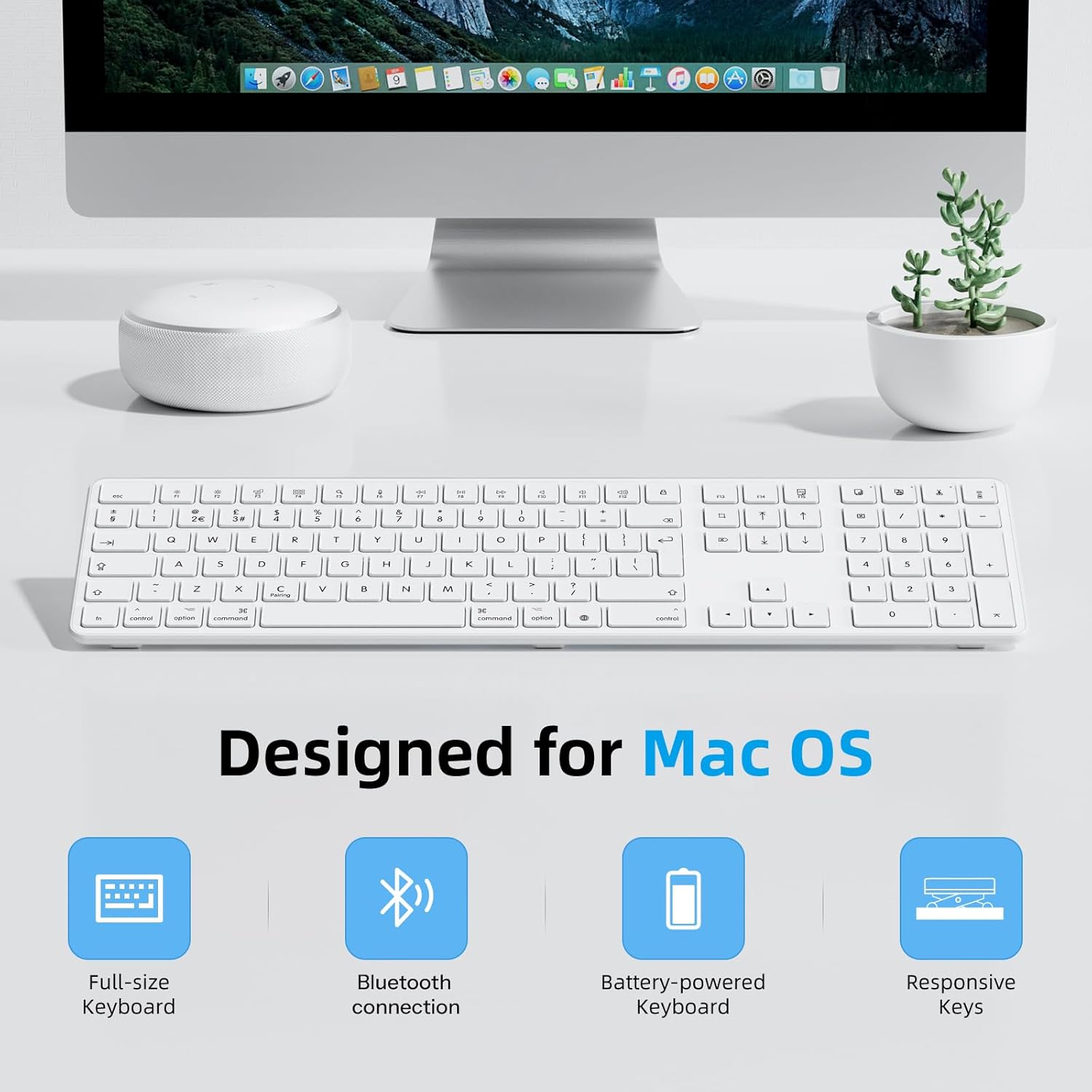 Bluetooth Keyboard for Mac os, OMOTON KB515 Full-sized Wireless Keyboard for Apple MacBook Pro/Air, iMac, iMac Pro, Mac Mini/Pro, Battery-powered, Multi-Device, QWERTY UK Layout (White)