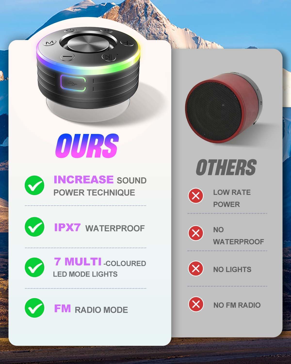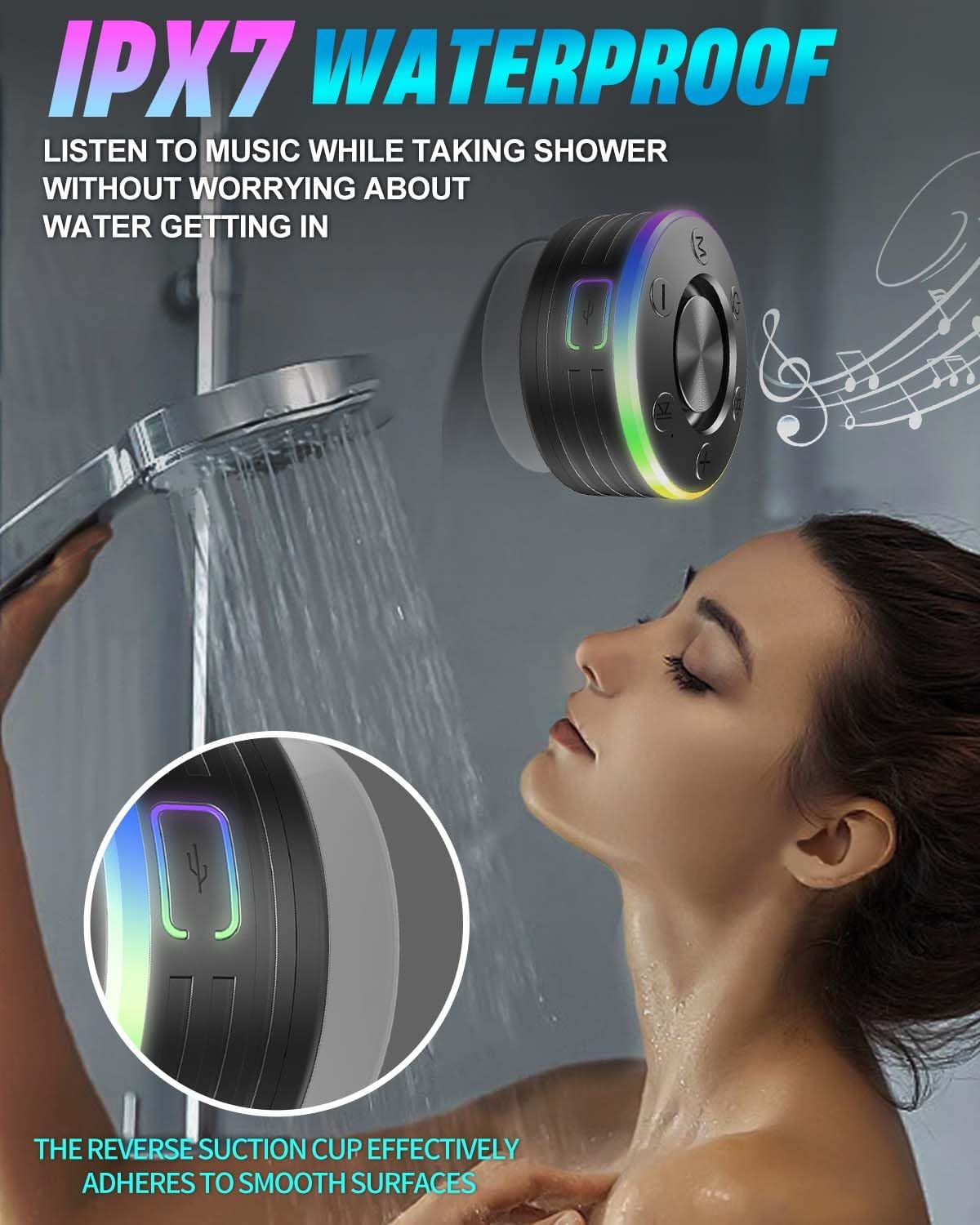 IPX7 Waterproof with Strong Suction Cup: This waterproof Bluetooth speaker is built to handle splashes, rain, and even full submersion, thanks to its IPX7 rating and durable silicone port cover that provides excellent internal protection. The powerful suction cup lets you attach the speaker securely to smooth surfaces like shower walls, glass, tiles, countertops, or the side of the tub. Perfect for use in the bathroom, by the pool, at the beach, or while hiking—take your music anywhere