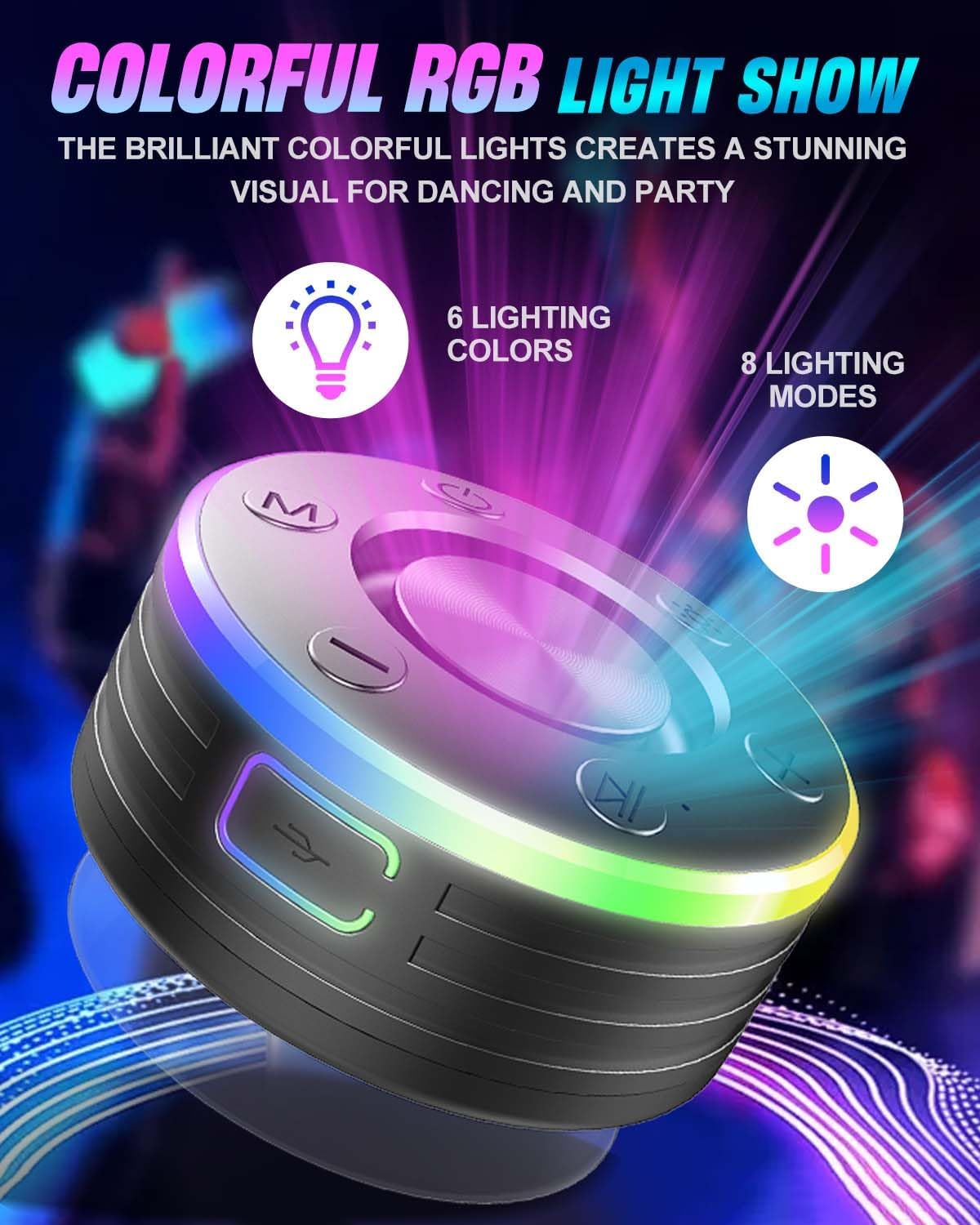 Vibrant RGB Light Show: This wireless speaker features 8 lighting modes and built-in six-color rainbow LEDs that pulse, flow, and glow in sync with your music. It brings a lively party atmosphere to any space—perfect for the house, yard, garden, or pool, especially at night. Great for both indoor and outdoor use, this LED party speaker also makes a fun and unique gift for kids, teens, and adults on birthdays or holidays