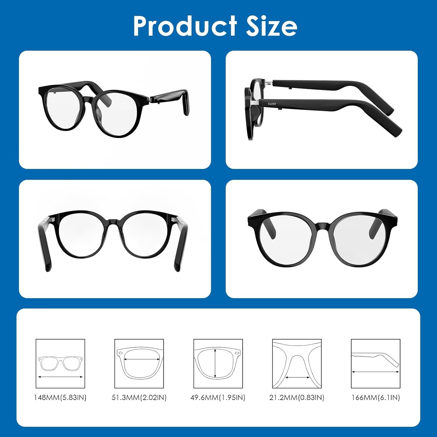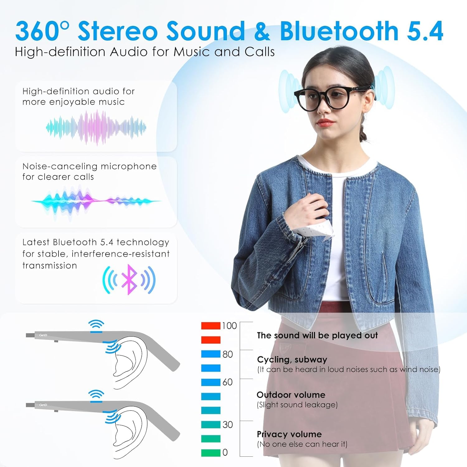 🎵【Music glasses】GetD smart music glasses use the latest Bluetooth 5.4 technology, the connection is more stable, and it perfectly supports the Apple Android AAC frequency band. Each temple has two upper and lower sound outlets, with better stereo sound effect, with GetD audio gain technology, so that GetD music glasses have better sound quality, better listening to music