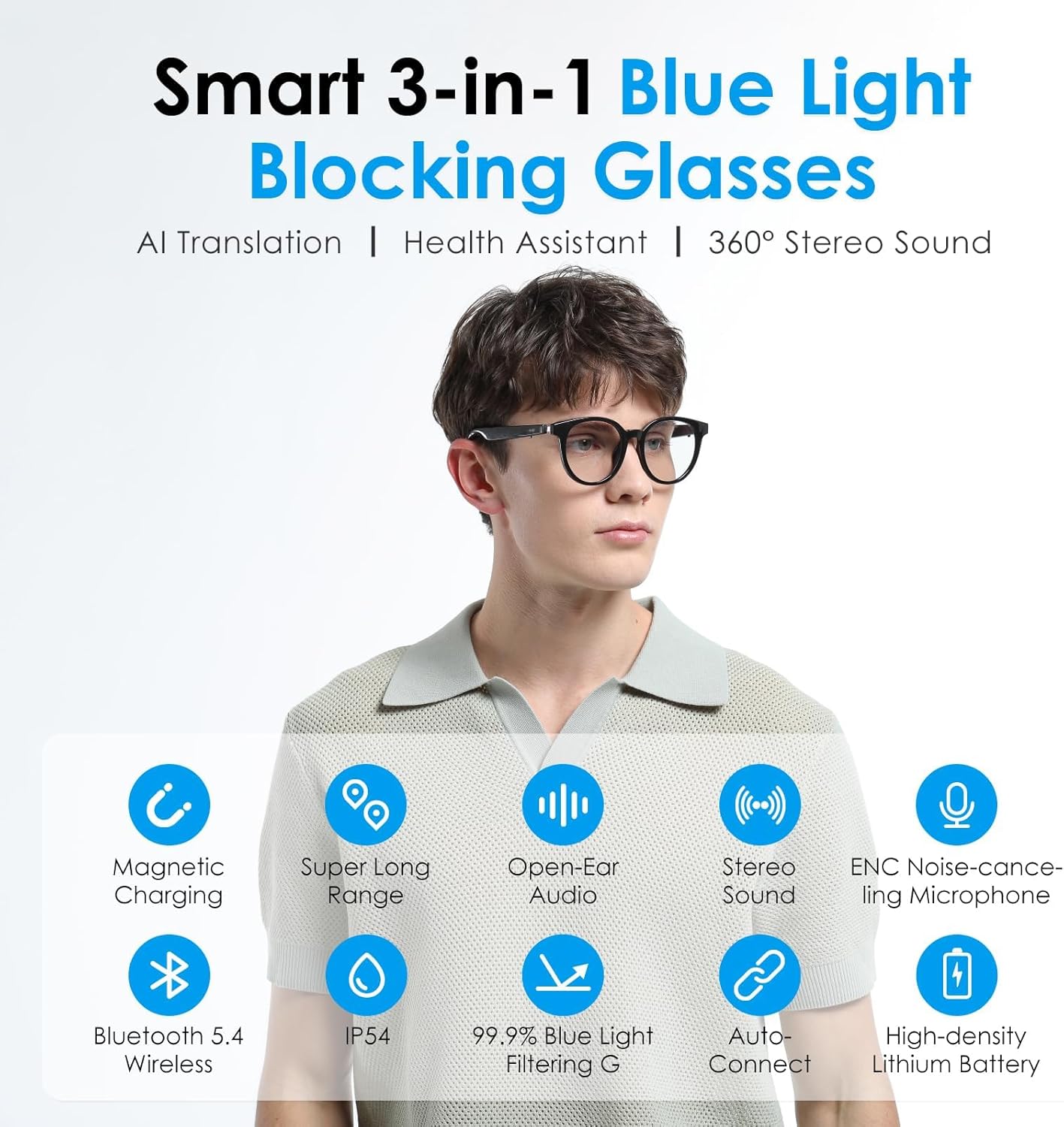 Bluetooth Sunglasses for Men/Women, Anti-Blue Light Lens, AI Translator Powered by GPT, 11H Battery, Polarized UV Protection, Smart Eyewear, Voice Control, Smart Eyewear for Travel Driving Meeting