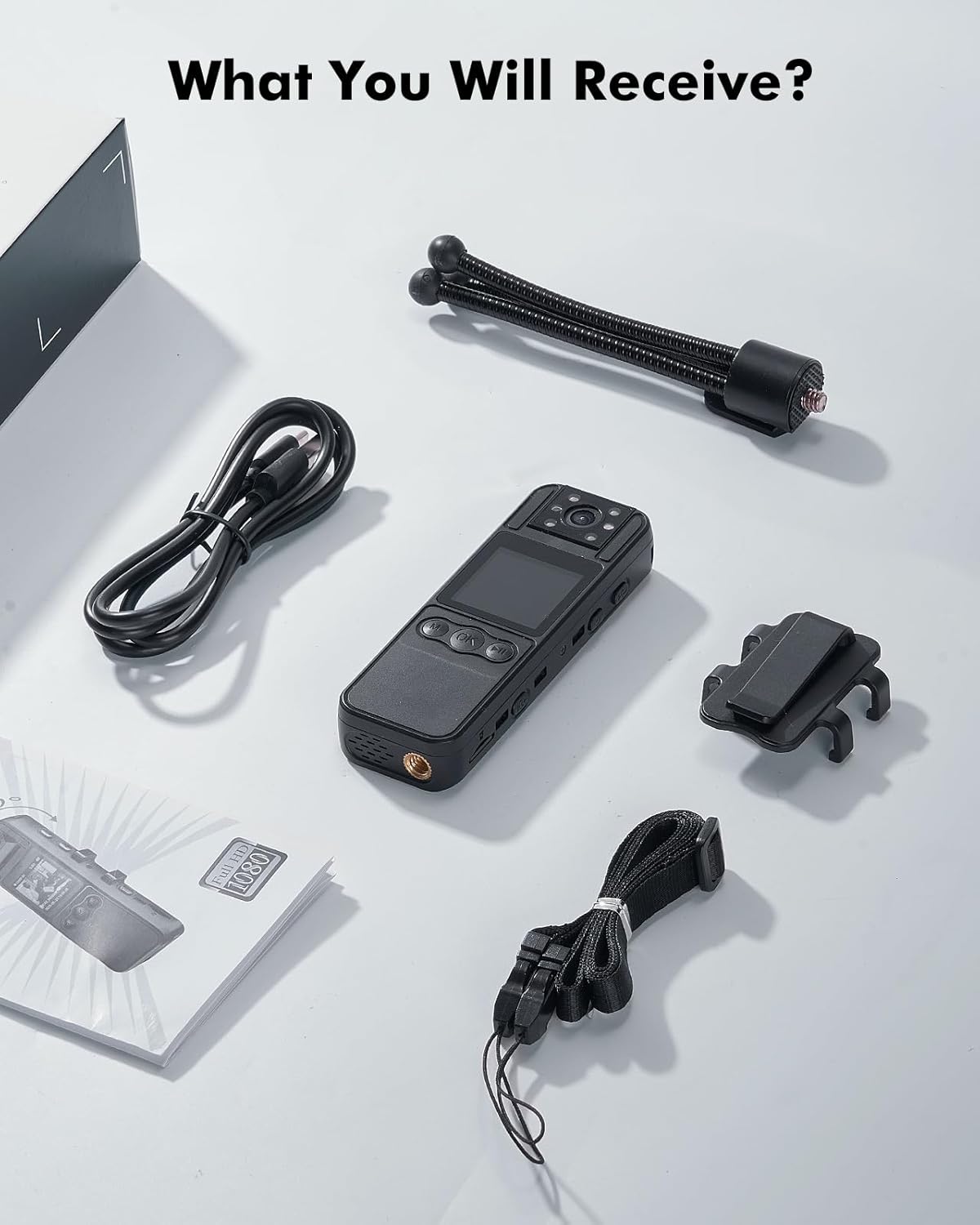A26 Security Body Camera with Exceptional Quality : Package includes 1* A26 Video Camera, 1* Tripod, 1* Back Clip, 1*Lanyard, 1*USB-C Cable, 1*User Manual.