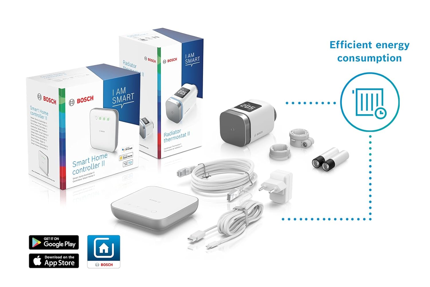 Box contents Amazon Edition: 1x Bosch Smart Home controller II, 1x radiator thermostat II