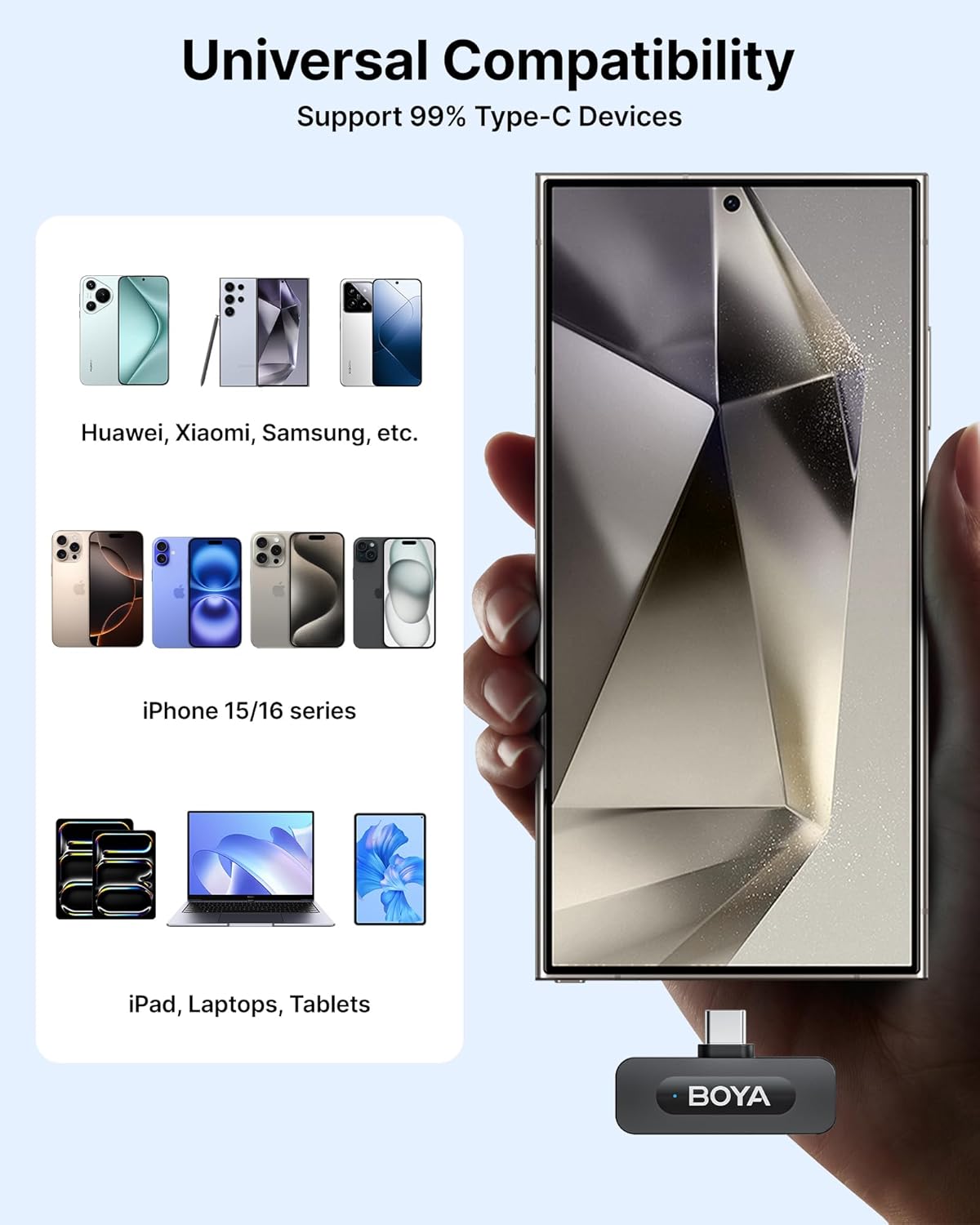 Plug and Play, Truly Wireless: This wireless microphone system offers a plug-and-play experience with a direct USB-C receiver—no adapters, Bluetooth, or apps needed. Just plug the USB-C receiver into your device, clip on the microphone, and start recording instantly. Compatible with Android phones, iPhone 15/16 series, and laptops, it ensures clear, crisp sound across devices, eliminating complicated setup for quick and easy recording.