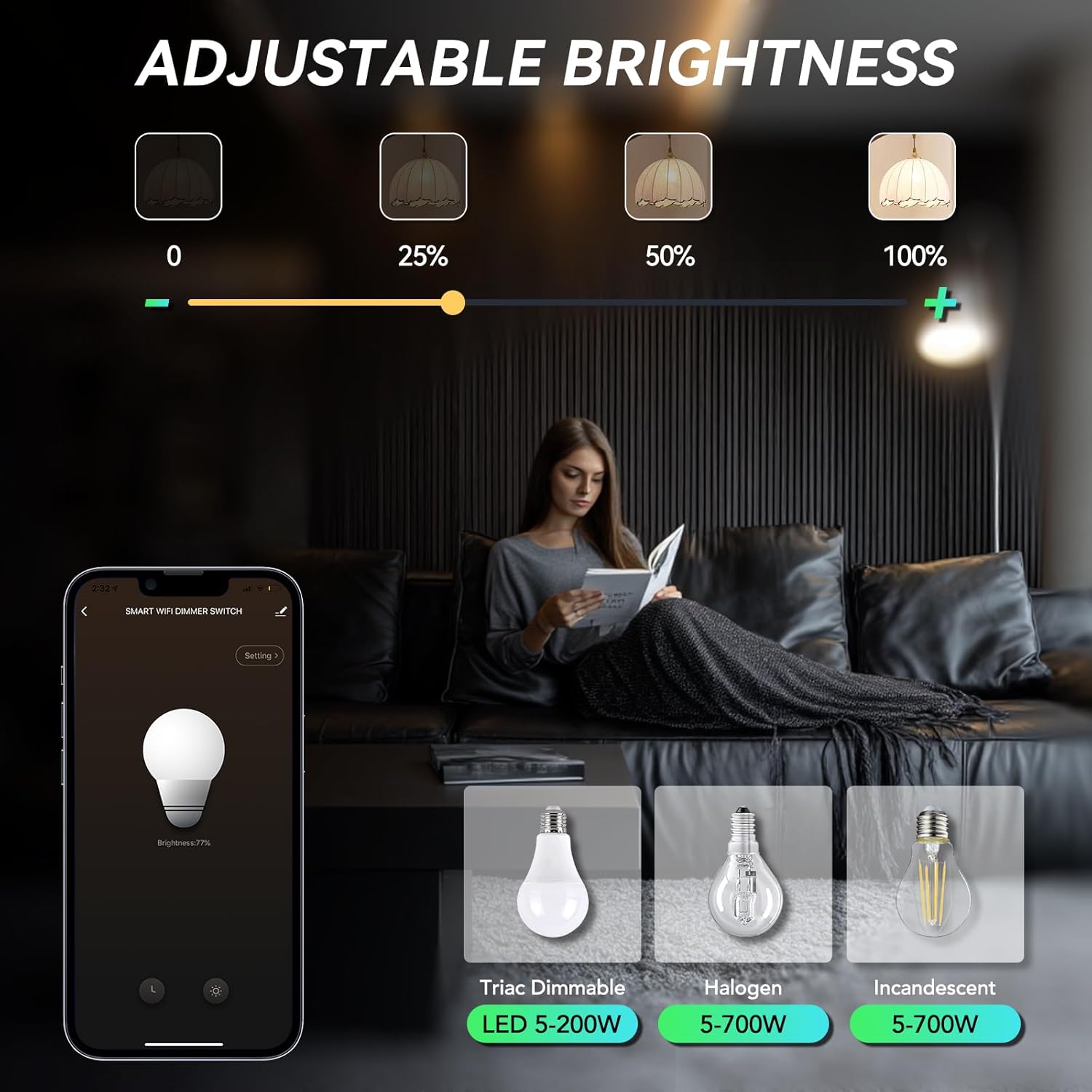 【Dimmable Bulb Compatibility】: Standard Types:Traic dimmable bulbs (5W-200W), halogen bulbs (5W-700W), incandescent bulbs (5W-700W). Important Note:Low-wattage LED bulbs (<5W) may cause flickering due to unstable current. For optimal performance, ensure bulb type and wattage match the specifications above.