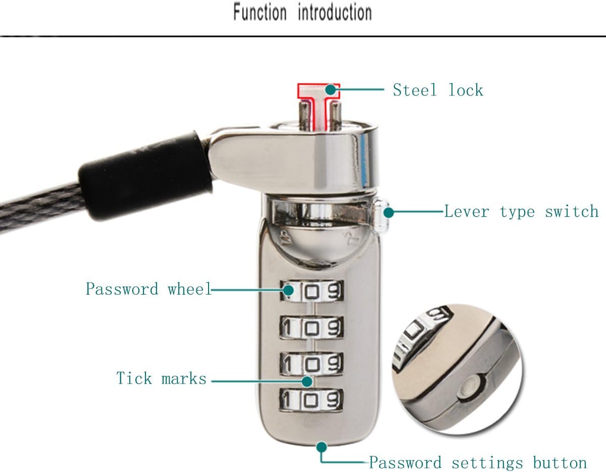 1.To avoid destroying your computer,do not try to pull out the locking device by force without correct combinations.2. Please remember the password combination you set, we can’t solve the problem caused by missed password combination.3.Before inserting the computer lock, please set a password and make sure it can be used normally, so as not to damage the computer if you forget the password.