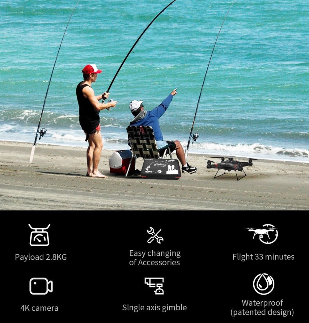 Special Feature 4K HD camera, Night illuminated navigation, Water proof, Multiple security system Included Components Drone, Remote control, 1355 propeller, Bait Drop+4Kcamera, Legs, 8000 mAh battery, Charger+cable, USB data cable, Battery capacitychecker, Storage disk, Carry Case Maximum load 2.8KG Flight time(No load) About 30min Flight time( Load 1kg) About 22min Flight time( Load 2.5kg) About 9.5min Single axis gimbal 4K camera Image transmission distance 1000m