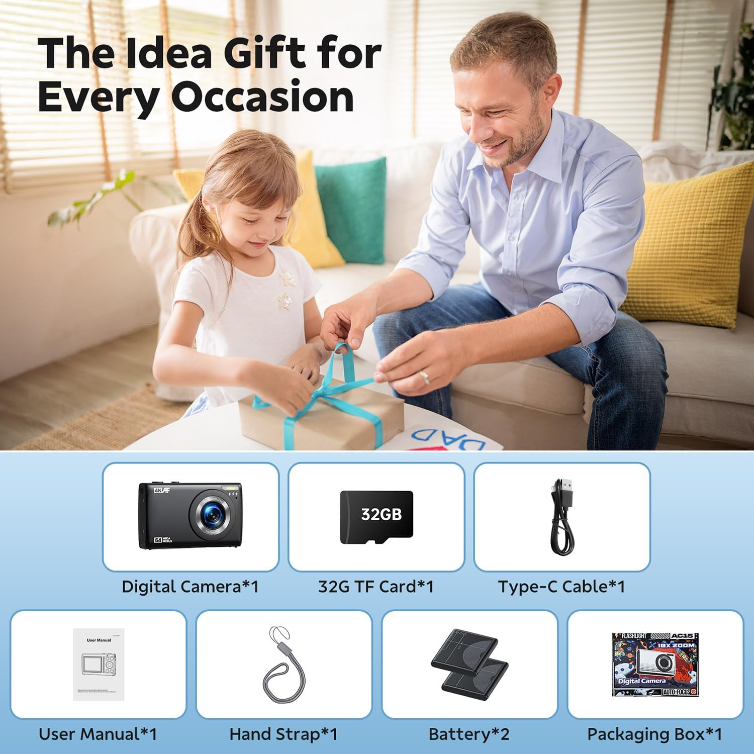【Portable and Out-of-the-box】 The travel camera weighs only 0.4 pounds, product size (0.78*3.7*2.1 inches) is easy to carry in your pocket. The package includes a 4k digital camera, 2 rechargeable batteries, a 32GB memory card, a lanyard, a USB data cable and a user manual. Get the product and use it right away, no extra expenses required