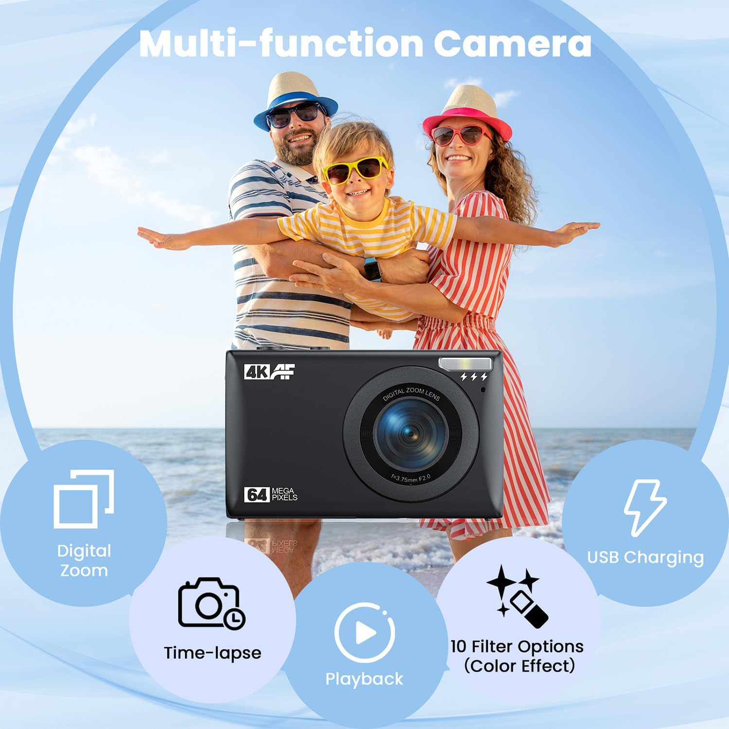 【4K 64MP Digital Camera】 The compact digital camera features the latest CMOS sensor technology and takes photos up to 64 MP resolution while supporting 4K 30 fps video resolution. The autofocus feature allows you to get sharp videos and photos with a simple click. Suitable for beginners of all ages