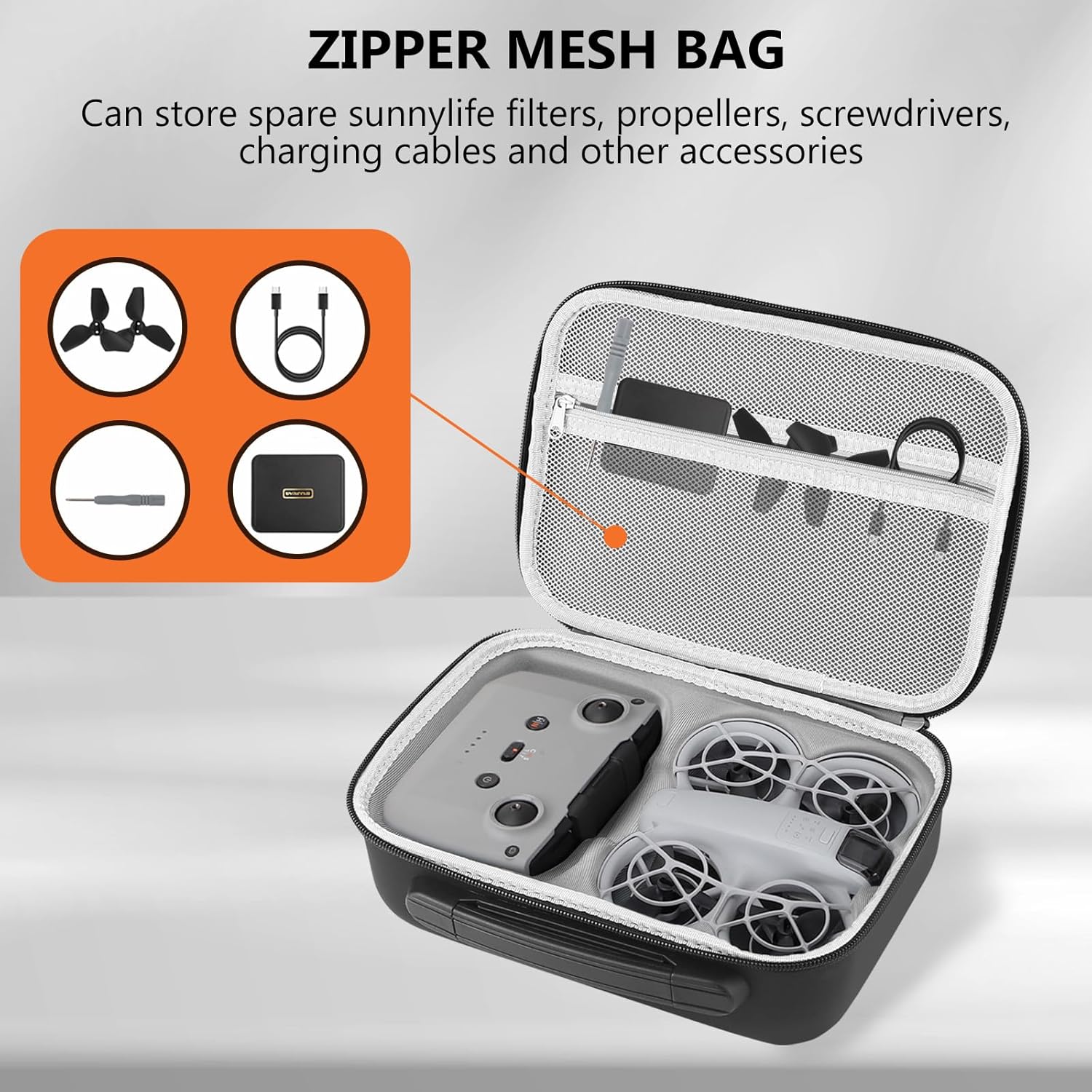 Compatibility:Perfectly compatible with the DJI Neo, this carrying case offers a seamless fit for all your drone and accessory needs.It can store dji neo drone (with gimbal protector), dji rc-n3 remote controller, 4 x intelligent flight battery (3 included in the charge hub), Two-Way Charging Hub, spare propellers, type-c to type-c pd cable, screwdriver, spare propeller screw, rc cable (sub-c connector), power adapter, control joysticks and other accessories.