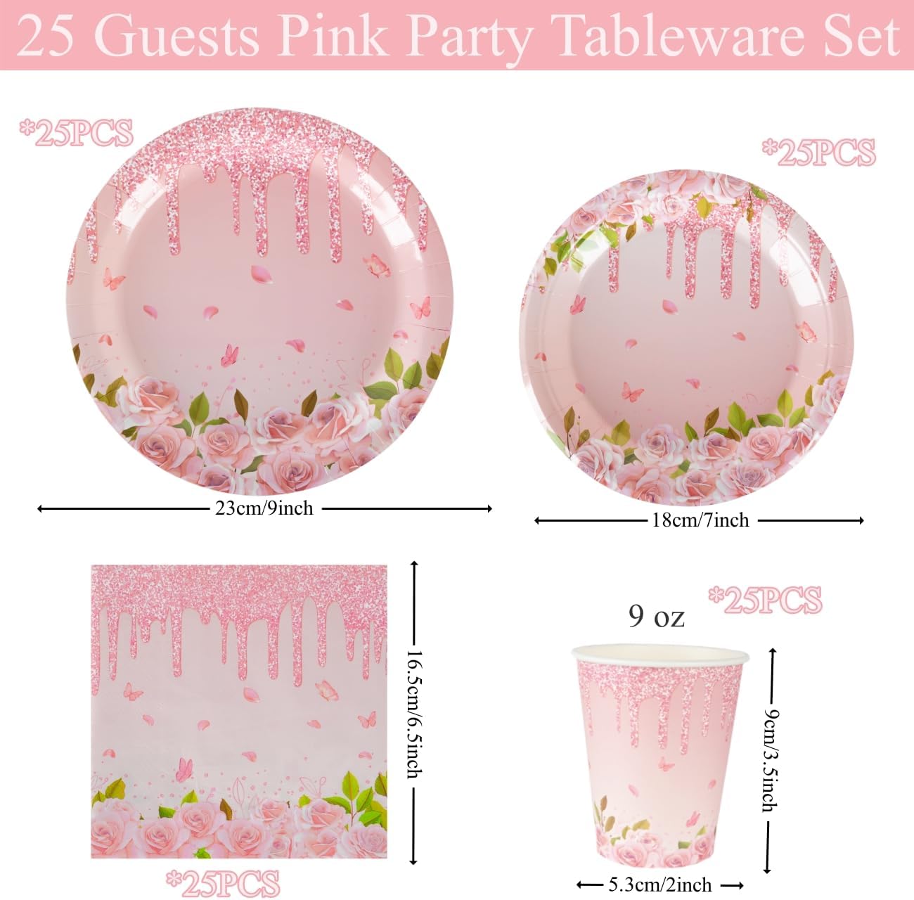 🌺25 Guests Pink Party Plates Set: Includes 25pcs x 9inch paper plates+25pcs x 7inch side paper plates+25pcs 9oz paper cups+25pcs napkin serviettes.