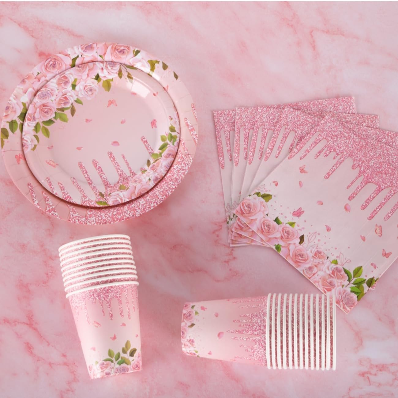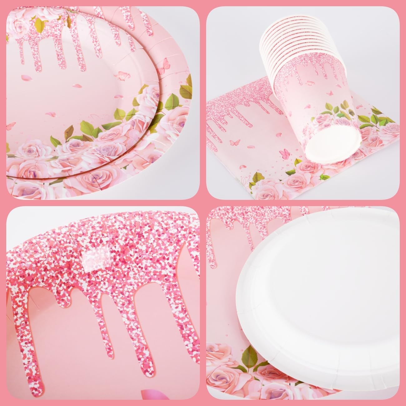 🌺Pink Floral Party Tableware Design: Our floral party themed tableware set looks so pink and cute with flowers, green leaves, gilt, petals and butterflies clearly printed on the paper plates, cups and napkins, this is a neutral party set for all kinds of parties!