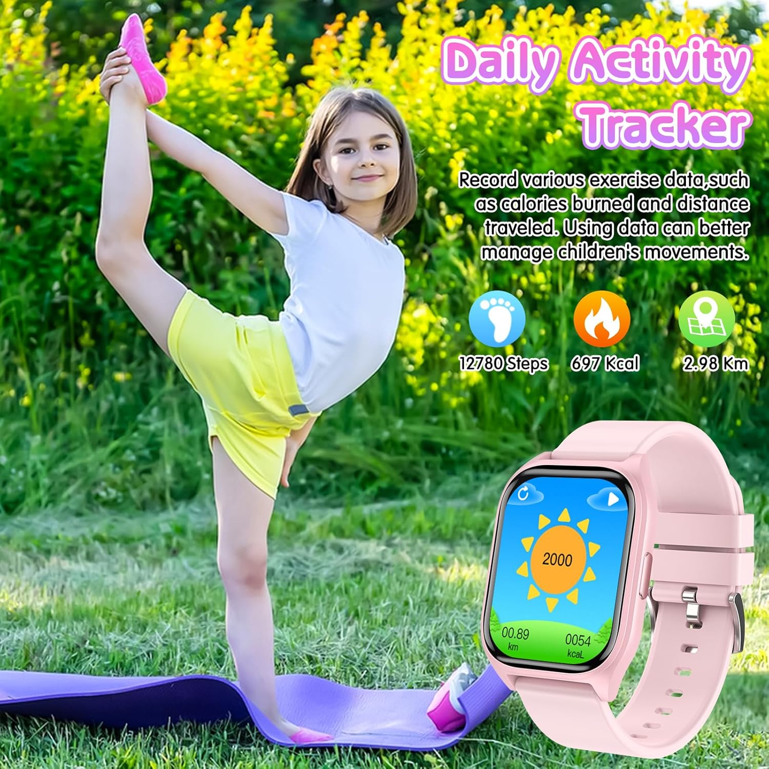 🎁[WIDE COMPATIBILITY AND MULTI-LANGUAGE SUPPORT] The waterproof smart watch for kids has a stylish and cute design.The 1.5-inch colour touch screen has adjustable brightness and lights up automatically when you lift your wrist. It has many fun and useful features, making it a great birthday, New Year and Christmas gift for children, boys, girls and teens.