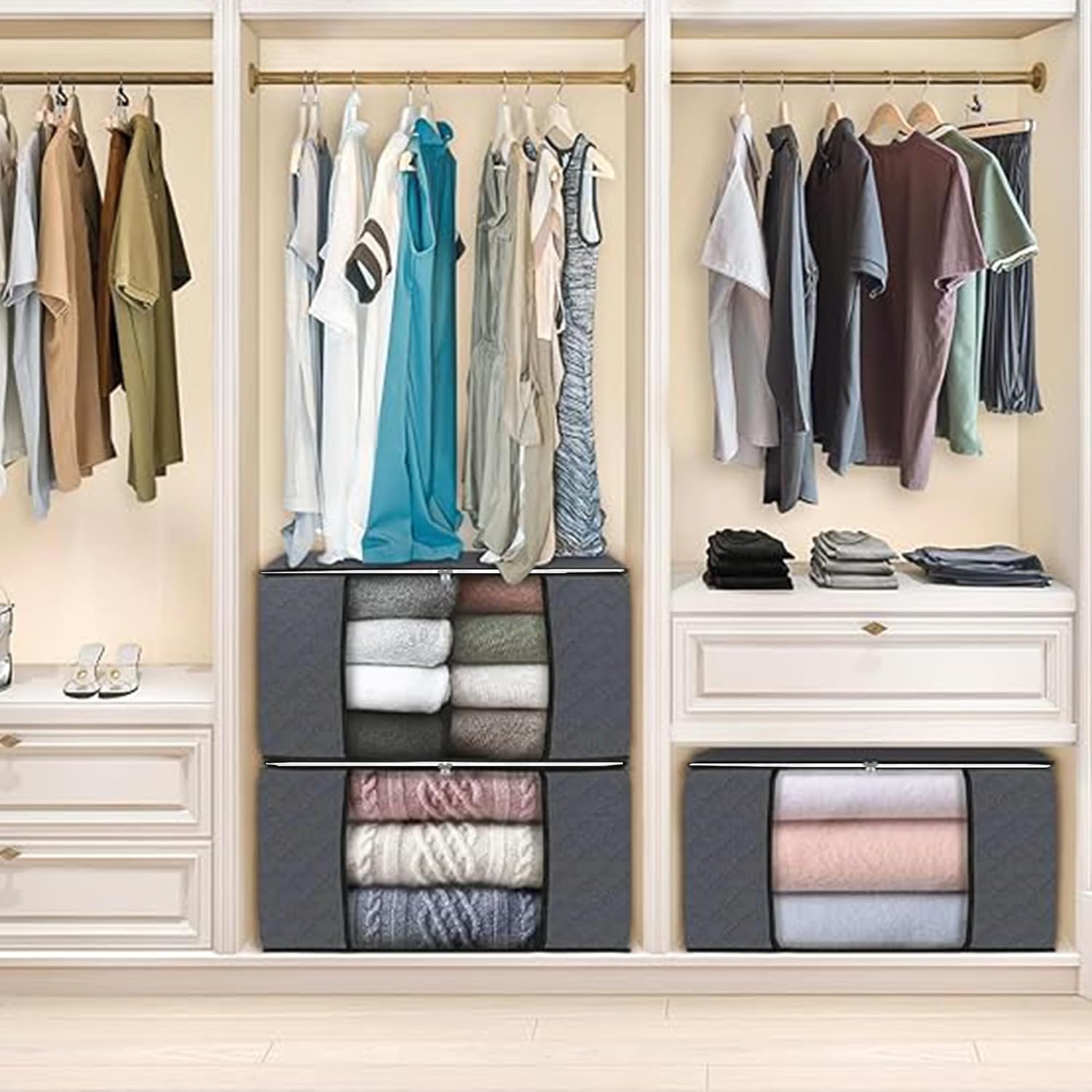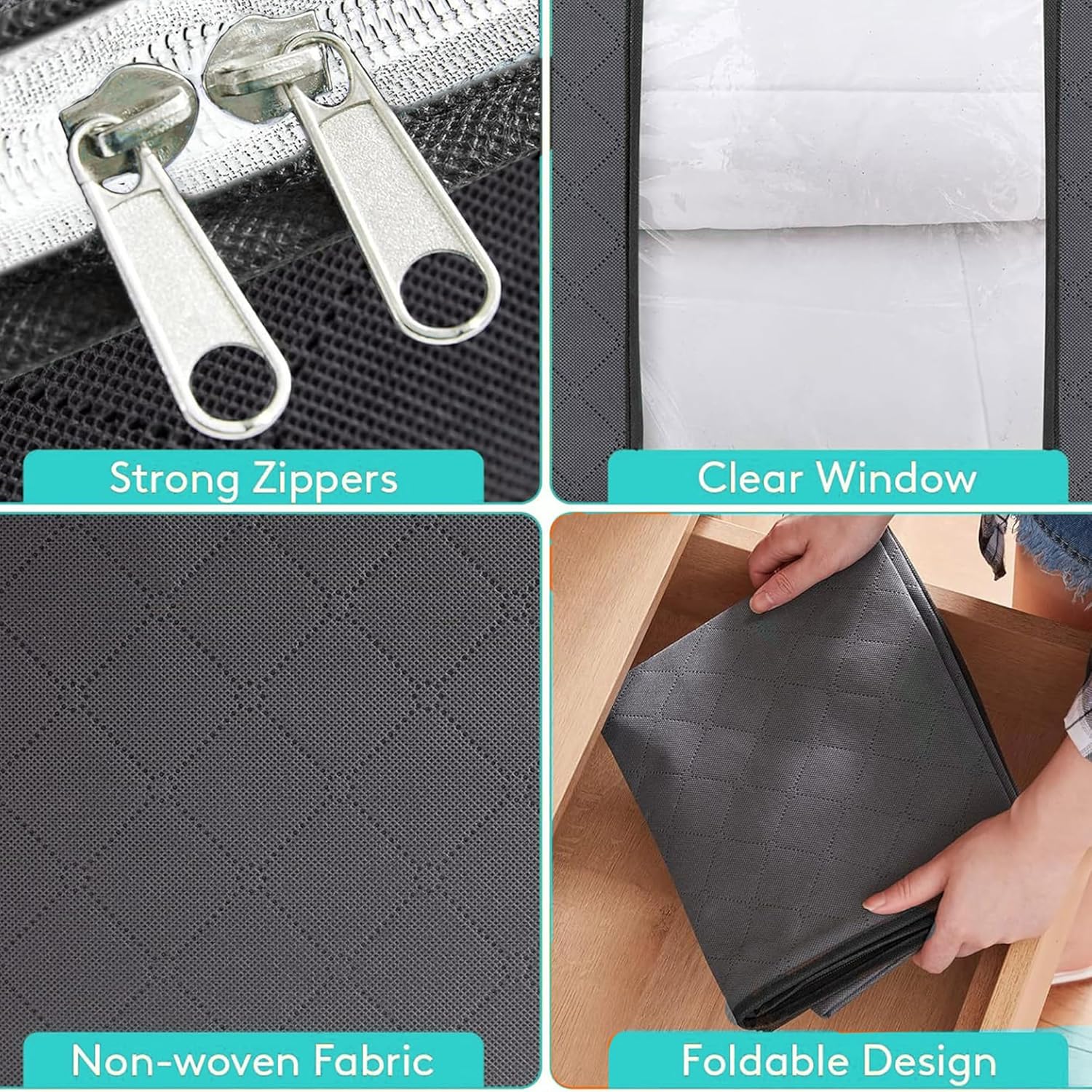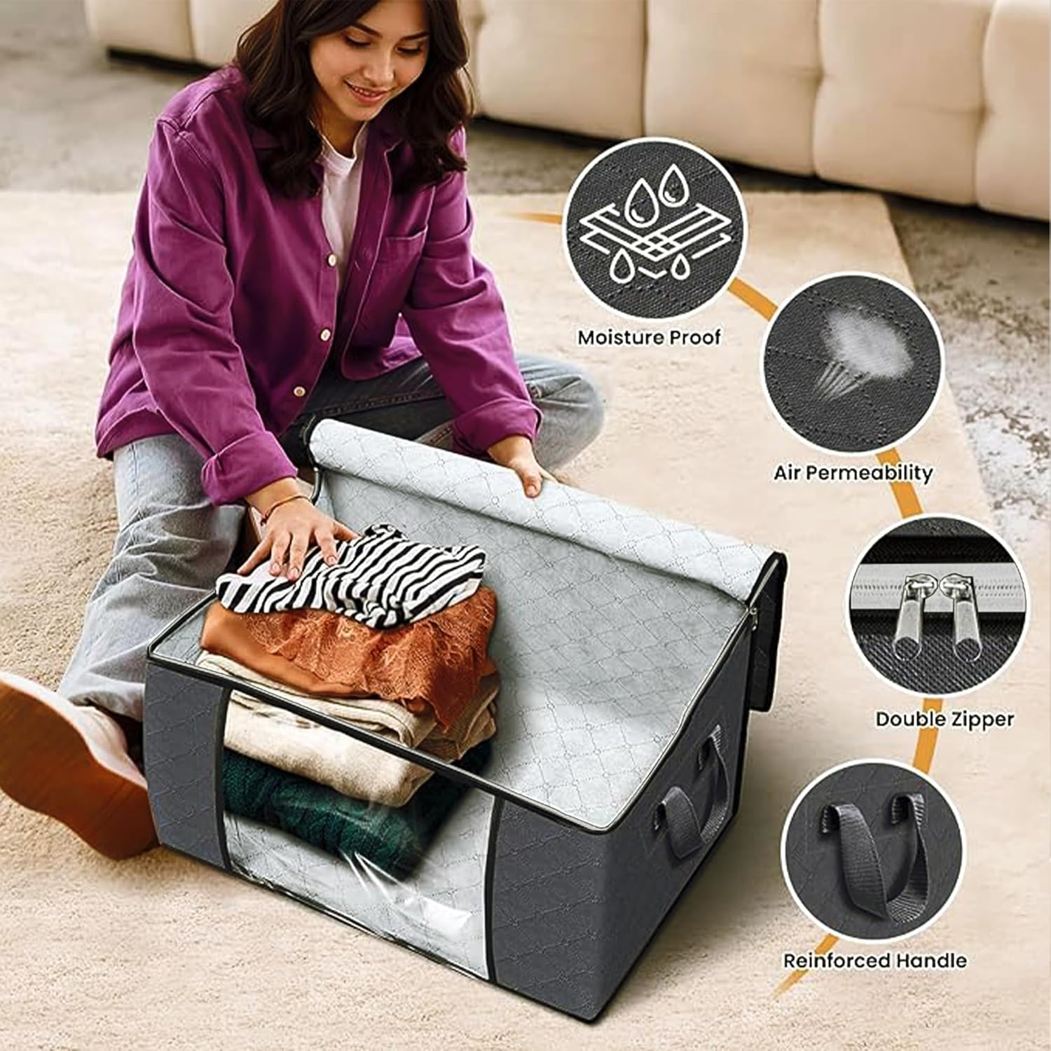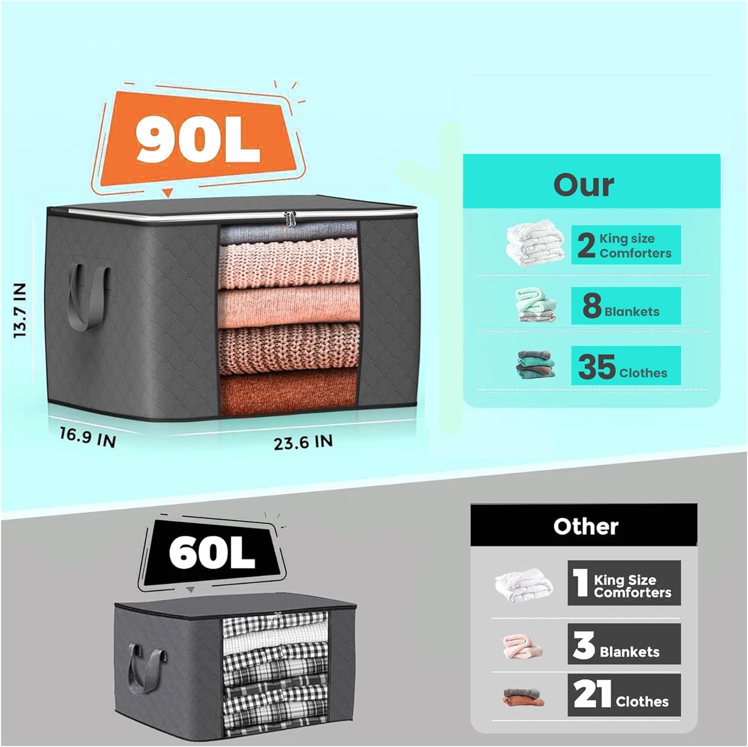 𝐋𝐀𝐑𝐆𝐄 𝐂𝐀𝐏𝐀𝐂𝐈𝐓𝐘 𝐒𝐓𝐎𝐑𝐀𝐆𝐄 𝐁𝐀𝐆𝐒: Our storage bags offer 90L ample space to accommodate all your belongings, whether it’s seasonal clothing, bedding, or even bulky items like comforters and blankets. Say goodbye to clutter and hello to organized living!