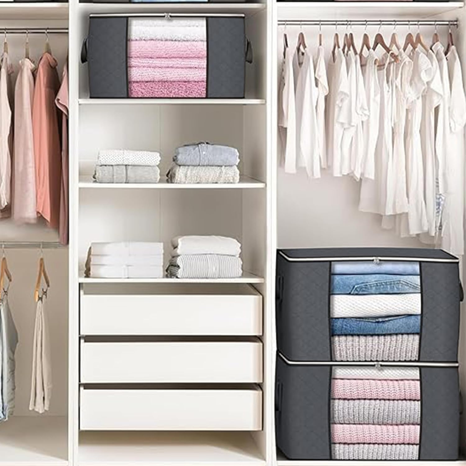 Very easy to fill and see inside the bags but there is no support on the sides and they will collapse if stacked on top of each other when not filled fully inside each bag.Clothes Storage Bags, 6 Pack 90L Large Capacity with Reinforced Handles, Thick Non-Woven Fabric Storage Bags, Organizer For Clothes, Blankets, Bedding With Zip And Clear Window Gray ColorArrived in a plain cardboard box with the storage bags further sealed in a vacuum sealed bag. The storage bags are folded very small and when opened up, are nearly the same size as a medium suitcase and have handles on either side as shown in the attached photos.Loading the storage bags is easy to do as the lid is zippered around 3 sides so that the lid can be folded fully open to allow access to all sides of the storage bag. This also helps load the storage bags with towels or dresses that they can be placed inside flat and not just bundled in.The window in the side allows easy viewing of the contents within the side or can be used to hold a label if multiple items are loaded into the storage bag.I would note a big caution on the bags as I could not get them to stack as shown in the adverts as there is no support in the side panels or at the corners. These storage bags are material only with no support ribs to allow stacking. The stacking requires the contents in the storage bags to be filled to the corners and fully from top to bottom. As shown in the attached photos, the storage bags will collapse at the corners without anything loaded on top therefore these are not as stackable as advertised.If these are in your search then I would say a note of caution that they are not as stackable as advertised and will not stay square in shape as advertised. I can however say they are very good storage bags and will store holiday clothes with ease and provide a good viewing window on the side to say what is in each bag.
