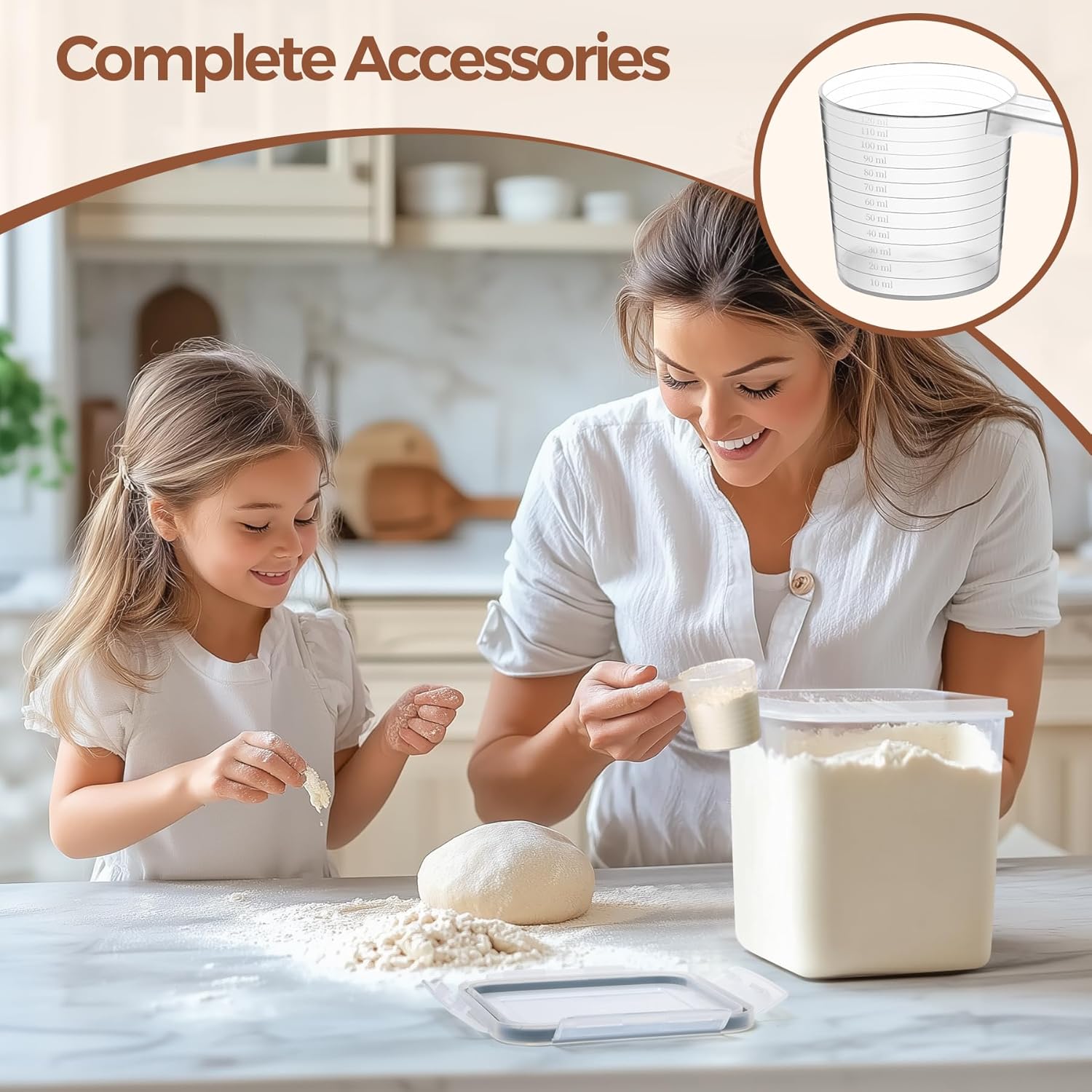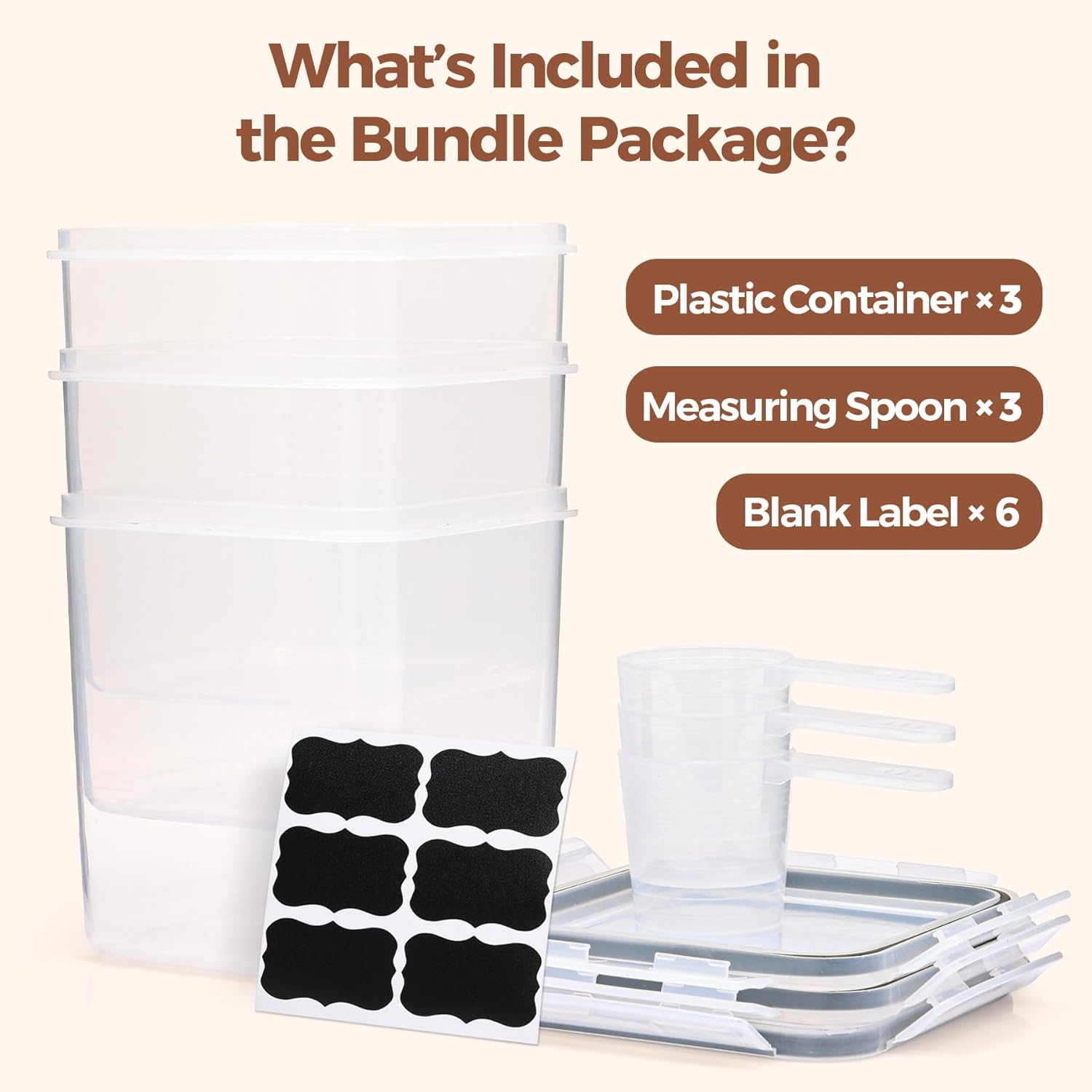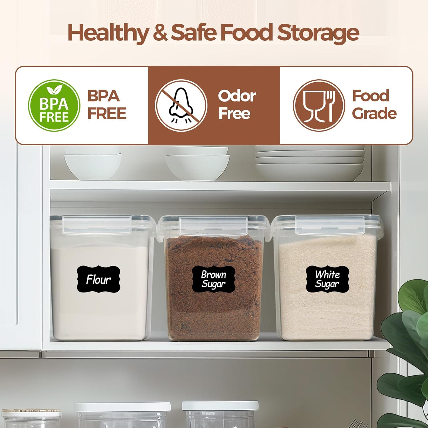 Accessories for Flour Storage: Our plastic dry food storage containers includes labels for identifying similar-looking ingredients and measuring spoons for precise use, ideal for keeping your pantry storage containers organized and functional