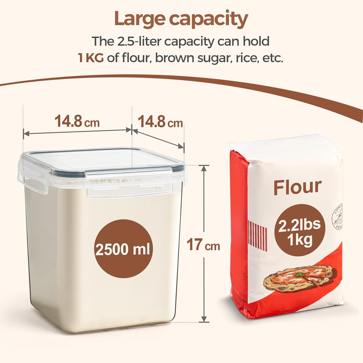 Ideal Size for Flour Storage: ComSaf flour storage containers hold about 1kg of pizza, almond, corn, or wheat flour. They can also be used as rice containers or cereal storage containers for grains, beans, and other dry foods