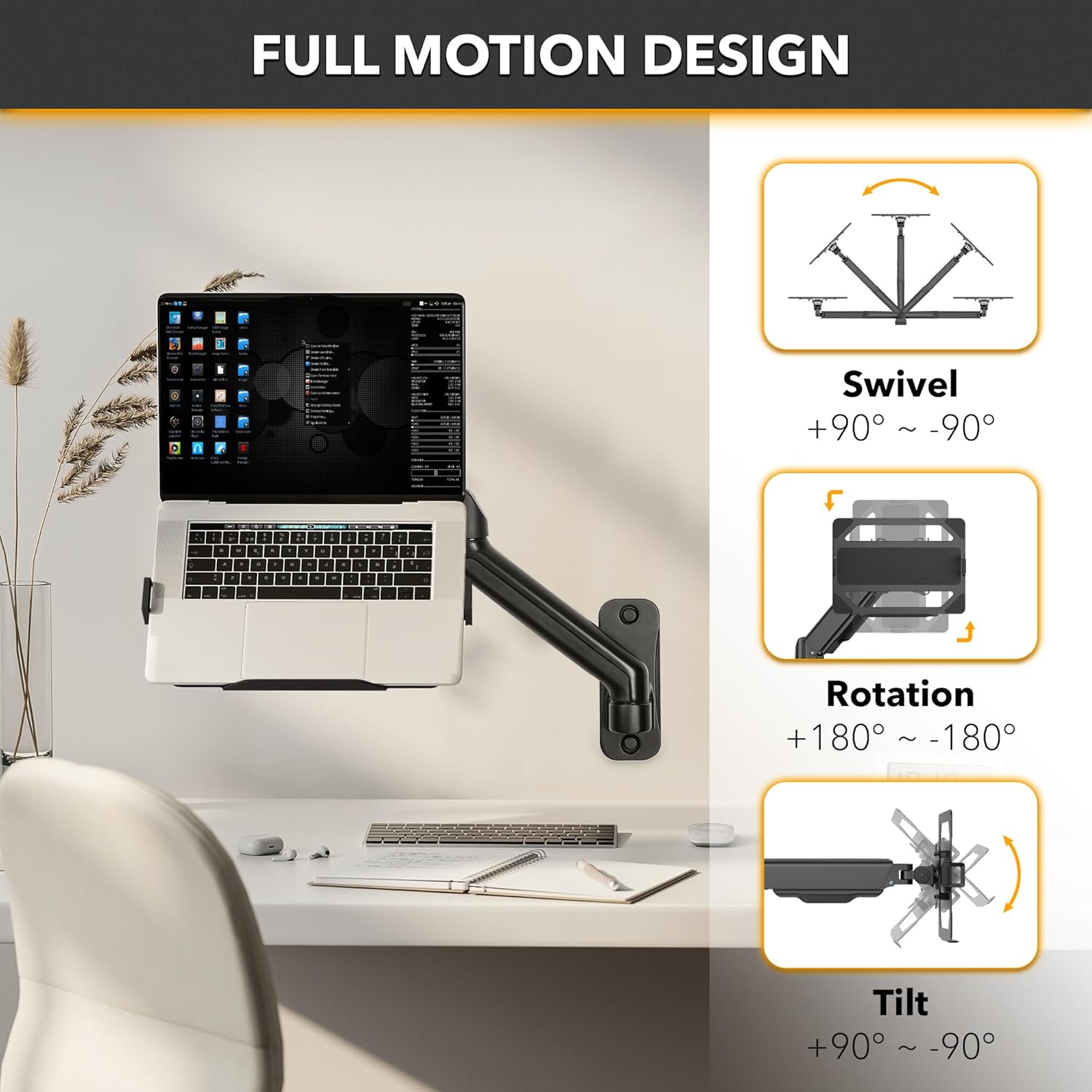 Free-Tilting Design – Enjoy a customizable viewing experience with the free-tilting design laptop arm that offers a tilt range of +90° to -90°. This flexibility in our wall mount allows you to adjust the angle of your laptop for optimal visibility and reduced glare.