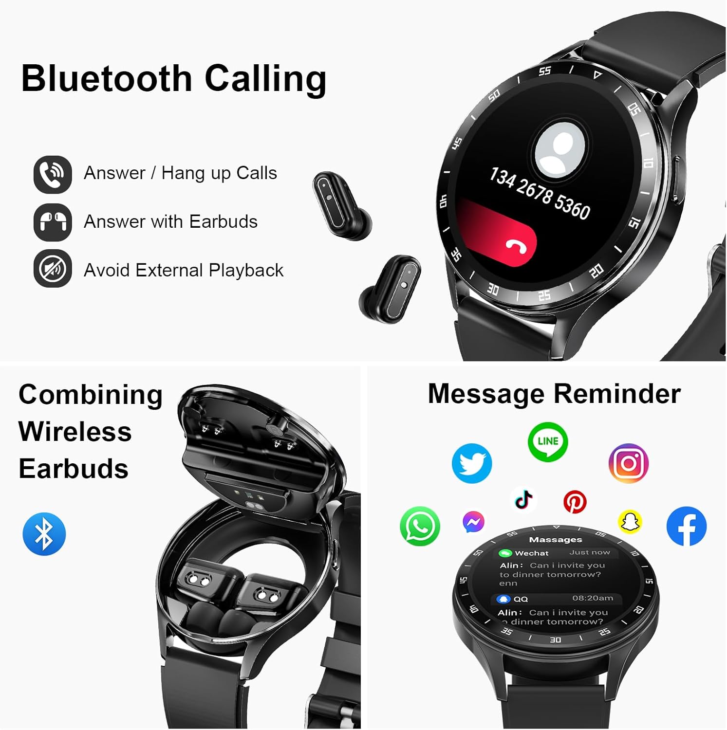【2 IN 1 SMARTWATCH WITH EARBUDS】 Combining wireless earphones with smart watches saves space for carrying multiple devices and improves the convenience of use. This all-in-one design makes it easier for users to enjoy music and take calls while exercising or traveling. Although the wireless earbuds are integrated into the watch, they still provide excellent sound quality, allowing users to enjoy music or calls with a clear and smooth listening experience.