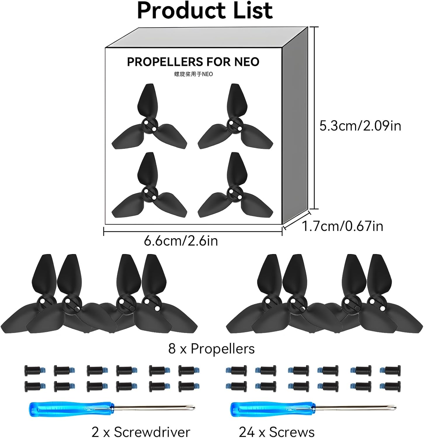 The Craznick Propellers for DJI Neo are a solid choice. The arrive in branded box each box contains the propellers screws and small screw driver. These propellers are designed to reduce noise and improve flight performance, making your drone flights smoother and quieter. These are well made durable and to be honest fit just as wellThe set includes four propellers, which are easy to install and compatible with the DJI Neo drone. The propellers are made from durable materials, ensuring they can withstand regular use and minor impacts ( hope that does not happen lol).Overall, the Craznick Propellers are a great option for maintaining and enhancing your DJI Neo drone’s performance