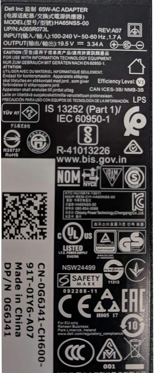 Specifications. Device Type: Laptop Power Adapter. Power Transformer: 65 Watt *** Input voltage: 100~240V -1.5A 50/60Hz ** Output: 19.5V 3.34A ** Power Capacity: 65W (Max) **