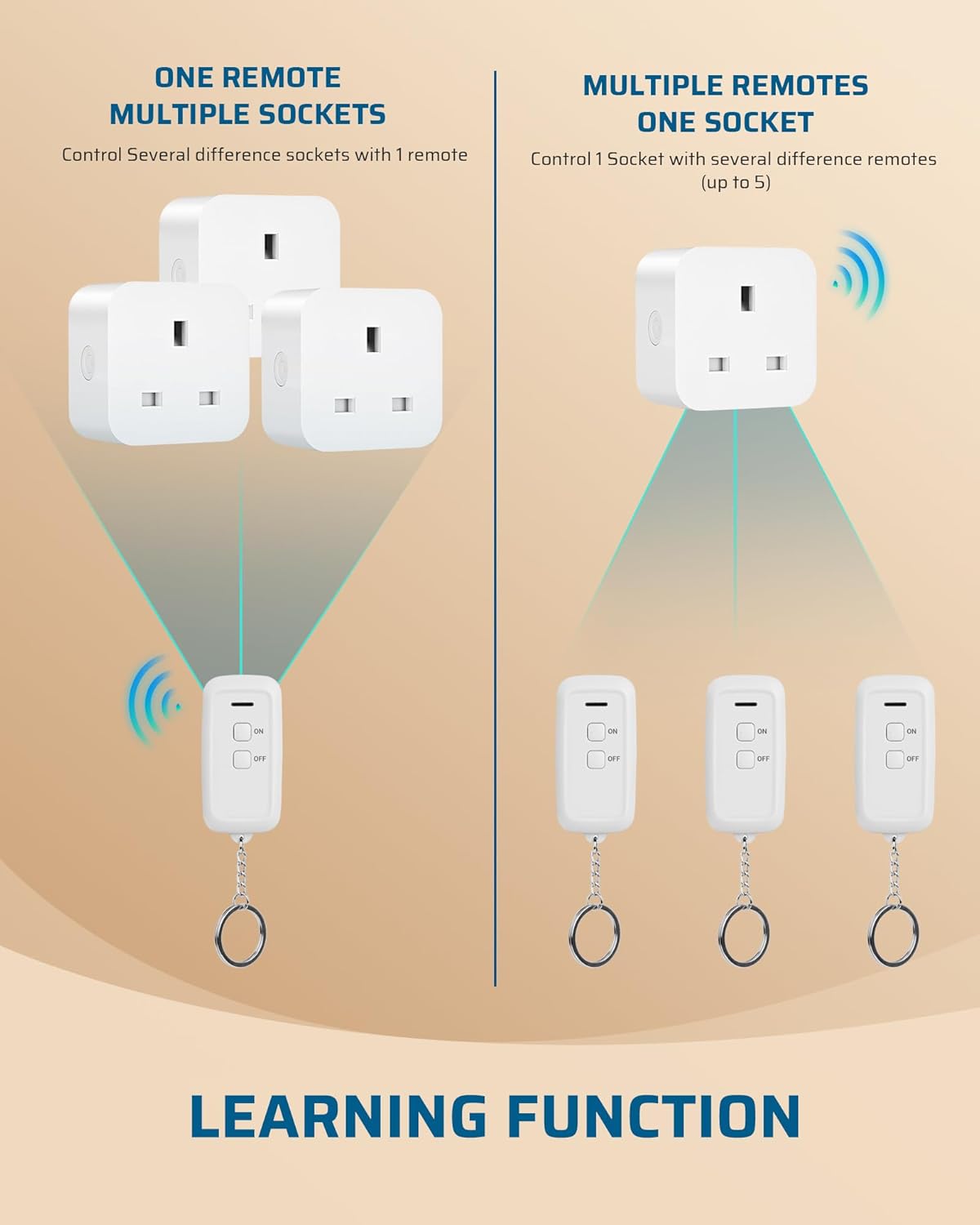 [Learning Function & Re-programmable] Transmitter and receiver have been pre-programmed for immediate use, signal non-interference, and you can freely add remote sockets (Same Model) to expand your remote control system with the learning function; the codes will be changed each time after re-programming by variable learning codes technology