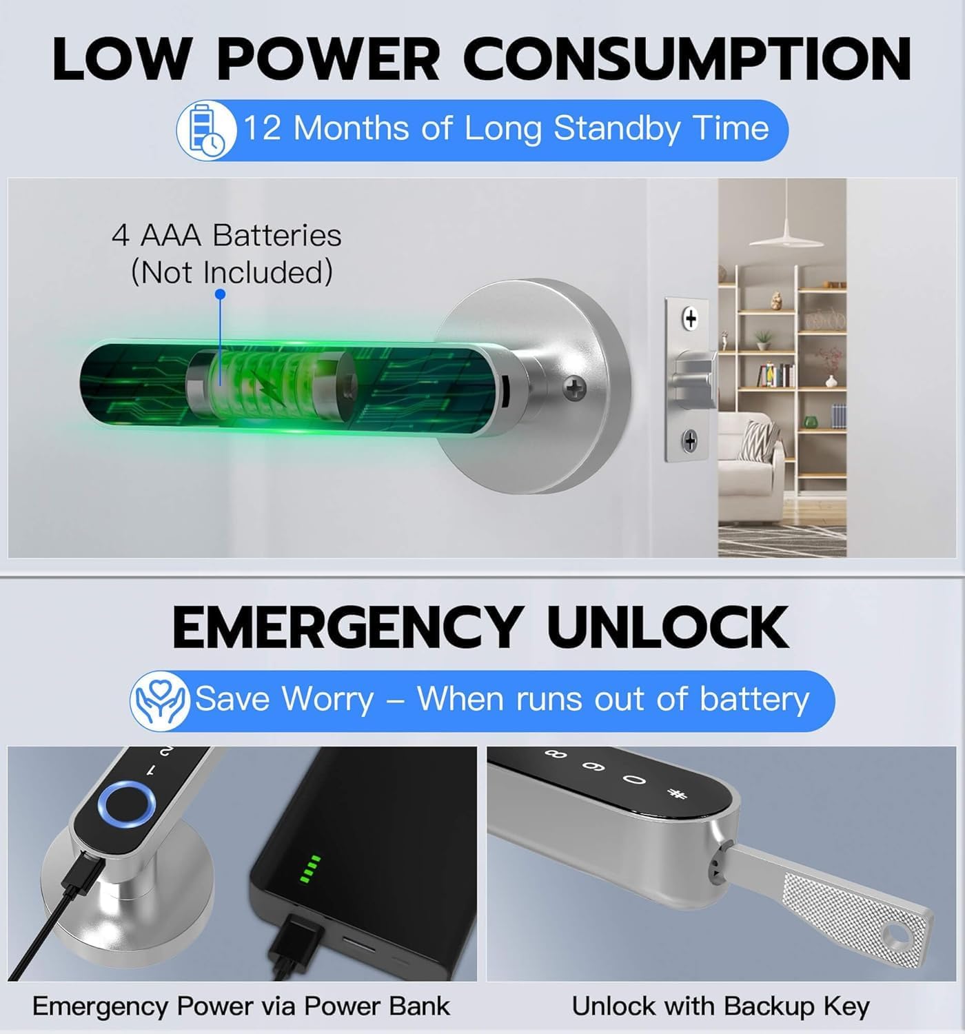 【LONG BATTERY LIFE】: The electronic door lock is low power consumption ensuring long battery life, don’t need to replace the battery in 1 year. And it will remind you when the battery is low. Even if it runs out of battery, you can use a power bank for emergency power.