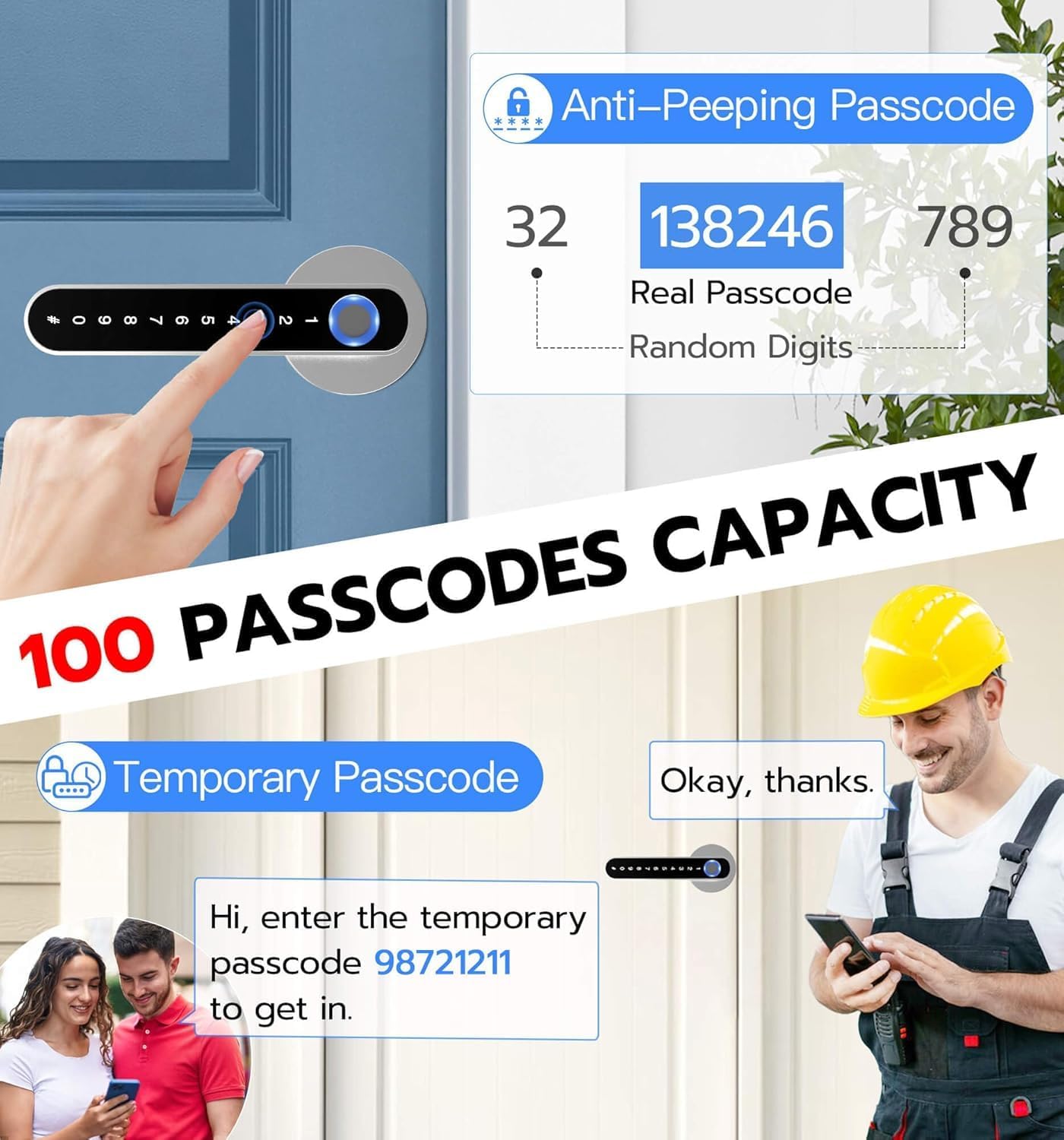 Passcode Capacity: 100.Customized 6-12 Digits Passcode.Anti-Peeping Passcode.Temporary Passcode.Single Row Large Area Touch Number Keys, precise input, not easy to accidentally touch.