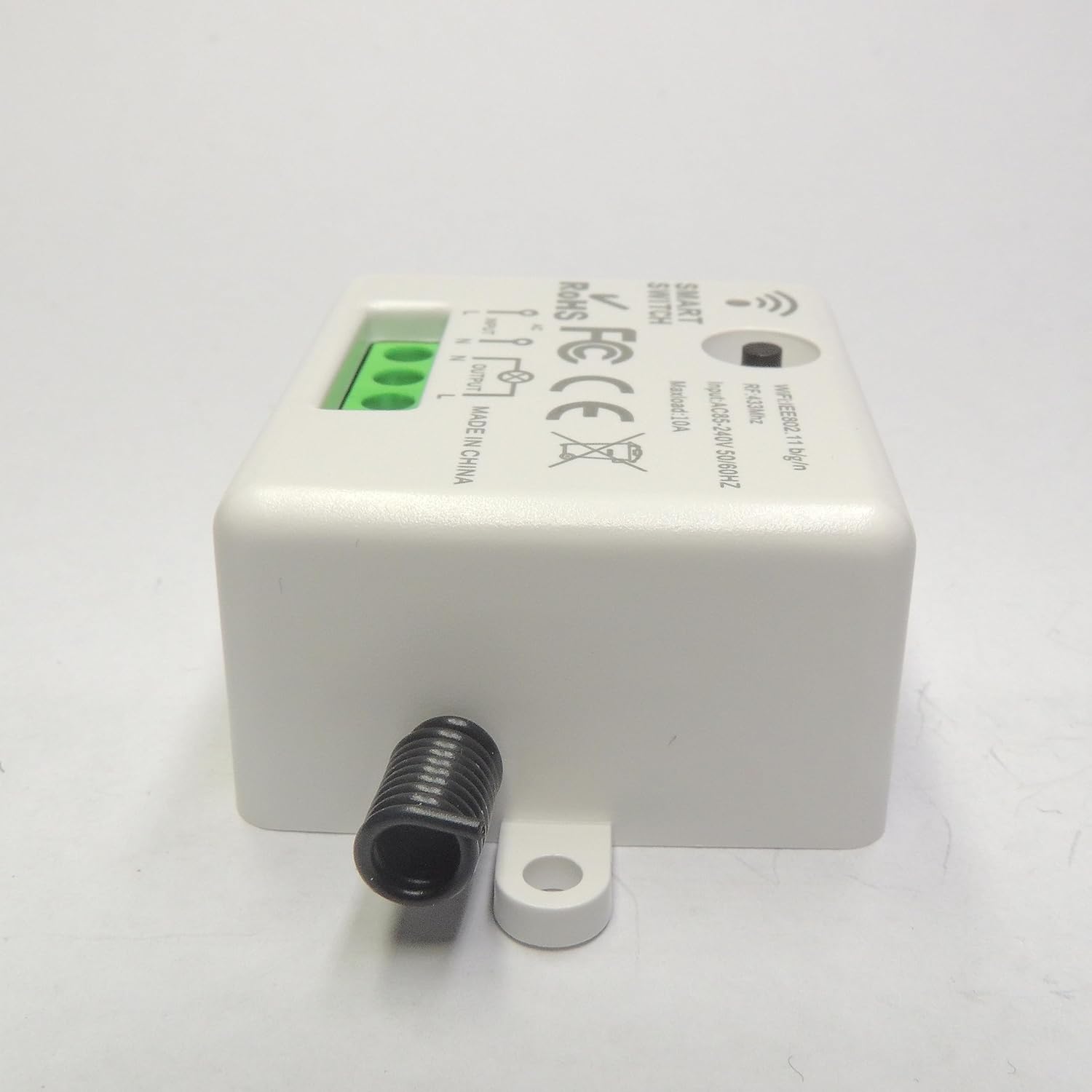【Easy Installation】 Mini wireless WiFi switch module with small size design, which making it is suitable for UK and EU wall switch boxes.The mini size of receiver is 47*42*23 mm. It installs between power supply and device, which can be easily hidden in most electrical boxes or junction boxes, or also use screws to fix on the board. You can easily to install it to control lights or plug. No wiring request.