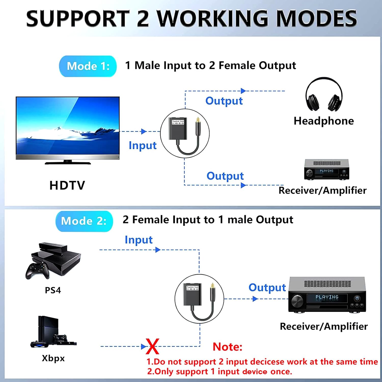 Recommended Correct Usage: Method 1: 1 Male inputto 2 female output: DVD Signal Source (Input) support 2 Power Amplifier(Output). Method 2: 2 Female input to 1male output: Only 1 Gam Console (Input) support 1 Power Amplifier(Output). Keep in mind that the Splitter’s 2 female jacks will not work properly as inputs.